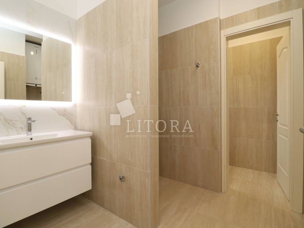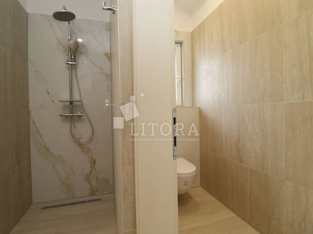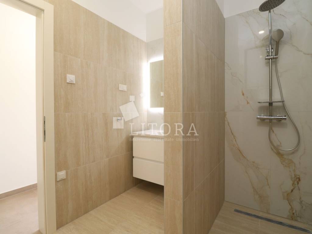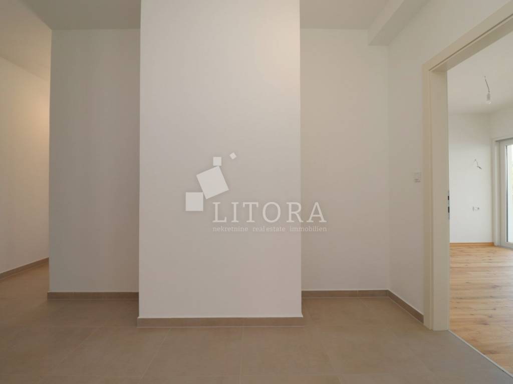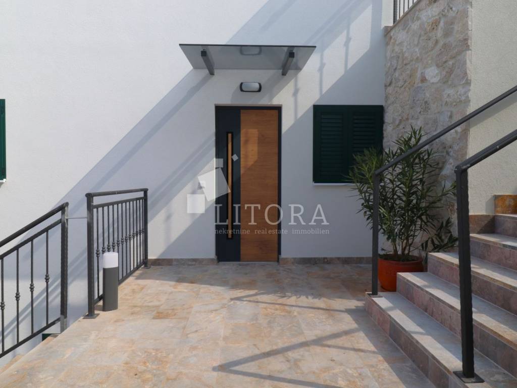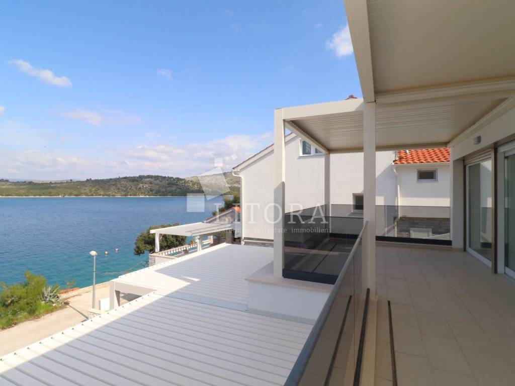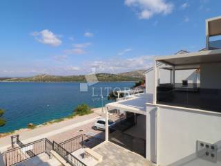 Šparadići – first row to the sea/beach, newly built three-bedroom apartment with a large terrace. The apartment is located on the 1st floor of a newly built residential building and is west-facing. The total usable area is 115,27m² and consists of an entrance hall, a kitchen with dining area and living room with access to a covered terrace of 31,50 m². The apartment also includes an additional hallway, three bedrooms, and a bathroom. The apartment comes with one parking space. It is ready for immediate occupancy and is equipped with electric roller shutters, insect screens, thermal façade insulation, parquet flooring in the bedrooms, and shutters. The distance to the well-maintained beach is only 10 meters.