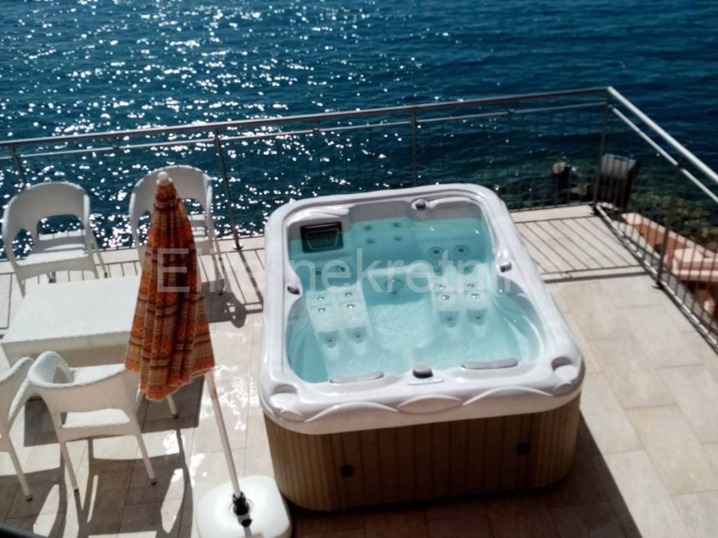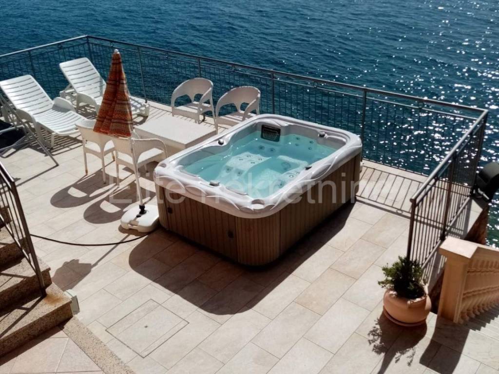 The surroundings of the building are nicely decorated, on it there is another terrace with a jacuzzi, from the terrace there is a path leading down to the sea and the landscaped beach where there is a small children's pool and barbecue.