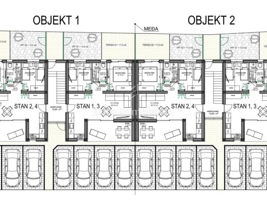 S1 (2 bedrooms, hallway, bathroom, living room + kitchen, terrace) – 62 m² + garden (22.50 m²) and 2 parking spaces (24 m²) – 111.56 m² – €260,000