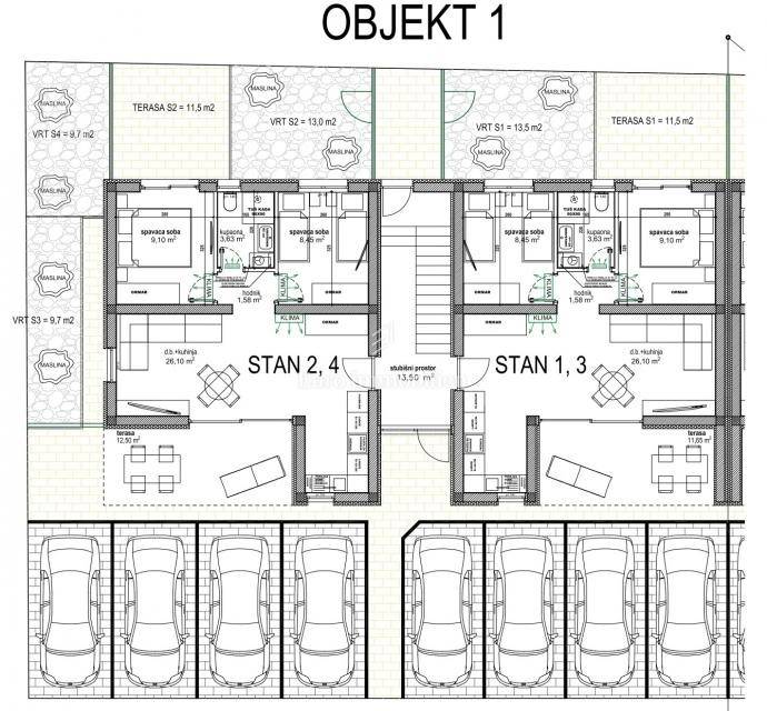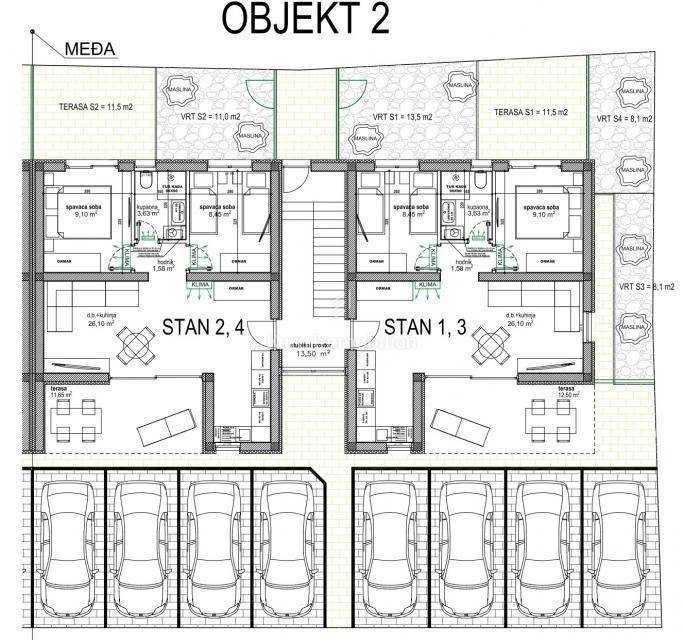 Apartments for sale in residential buildings under construction, located 70 m from the sea on the southern side of Vir Island. The property consists of 4 residential units spread over the ground floor and the first floor.