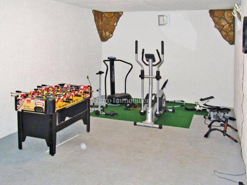 The basement is arranged as a gym. The ground floor consists of an entrance terrace, kitchen, living and dining room, one bedroom, bathroom, WC, storage and a garage (currently used as storage). The first floor offers six bedrooms, two bathrooms and a terrace.