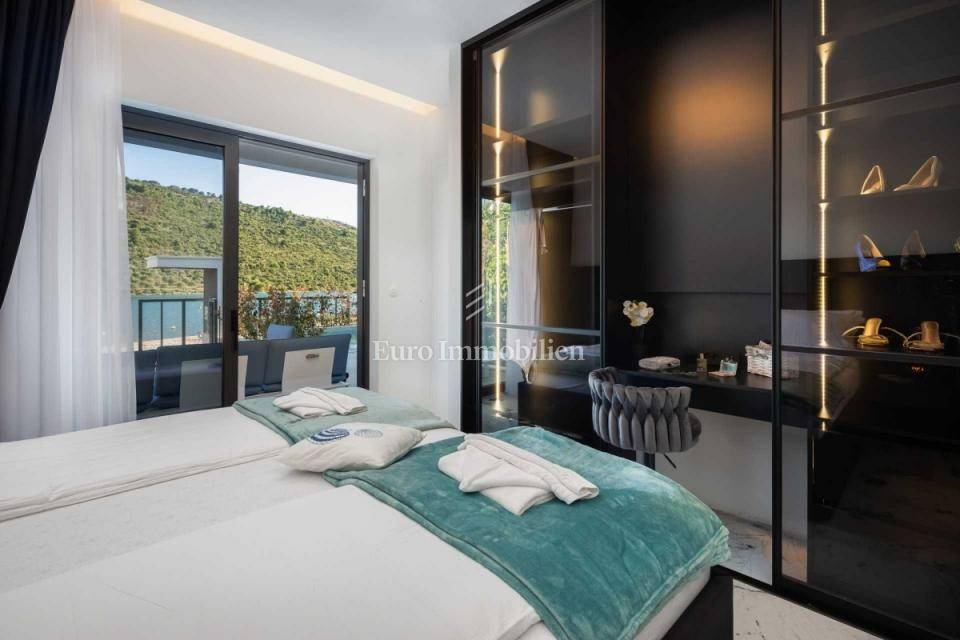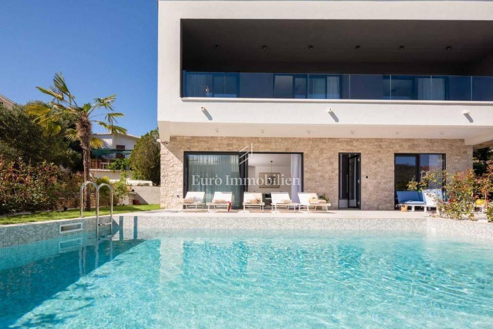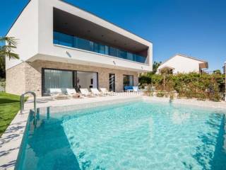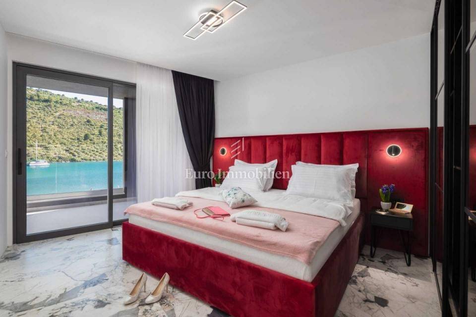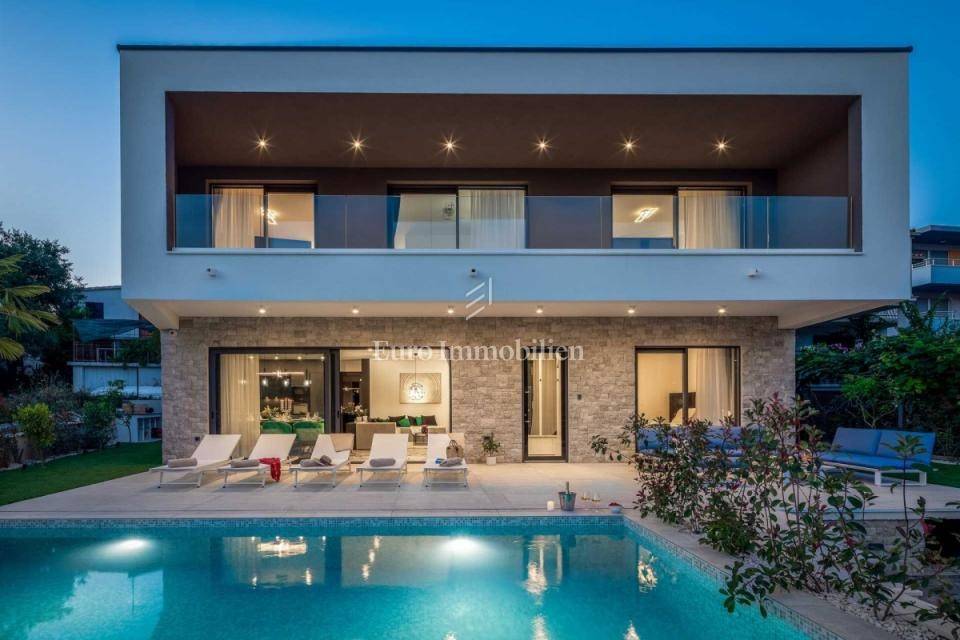 A modern newly built villa with a pool is for sale, situated in the first row to the sea near the town of Rogoznica.