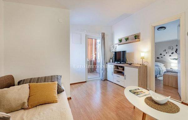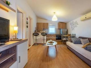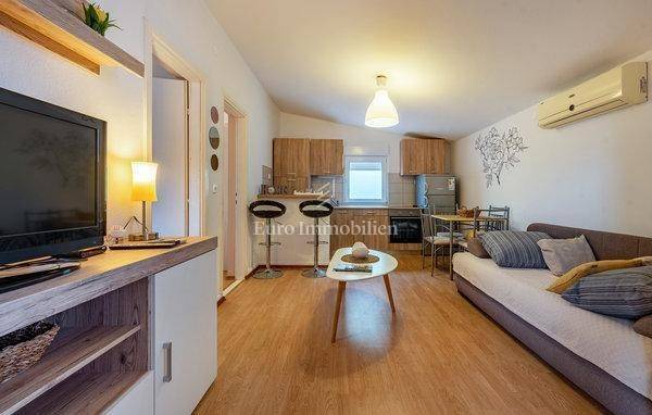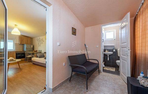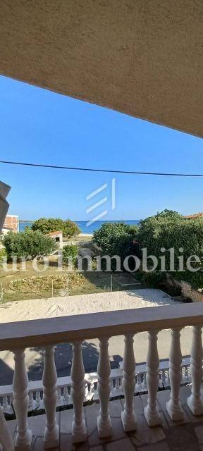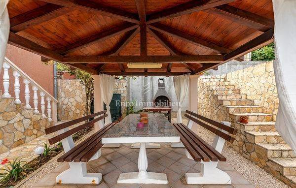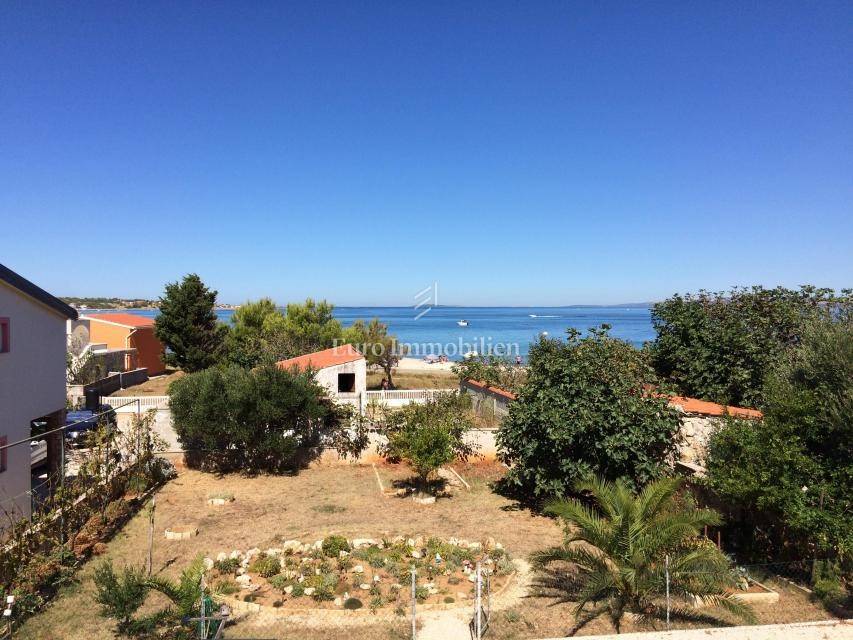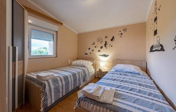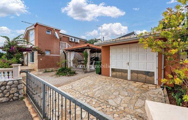 The house of 145 m2 extends over the ground floor and first floor. On the ground floor and on the first floor there are apartments of the same layout with two bedrooms, a living room, a dining room and a kitchen, a bathroom, and a covered terrace. It has a beautiful view of the sea. It is for sale fully furnished. The yard is landscaped and maintained, there is also a garage in the yard, and 4-5 parking spaces located in the field in front of the house, which is sold together with the property.