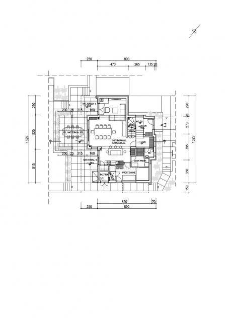 GROUND FLOOR - living room + kitchen + dining room, storage room, utility room, sauna, toilet, three covered terraces