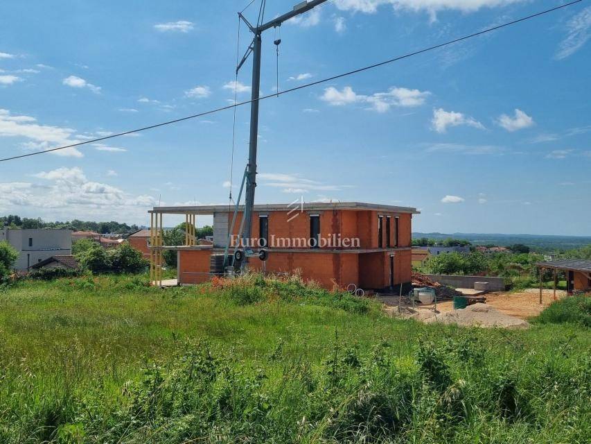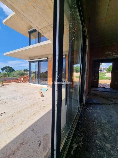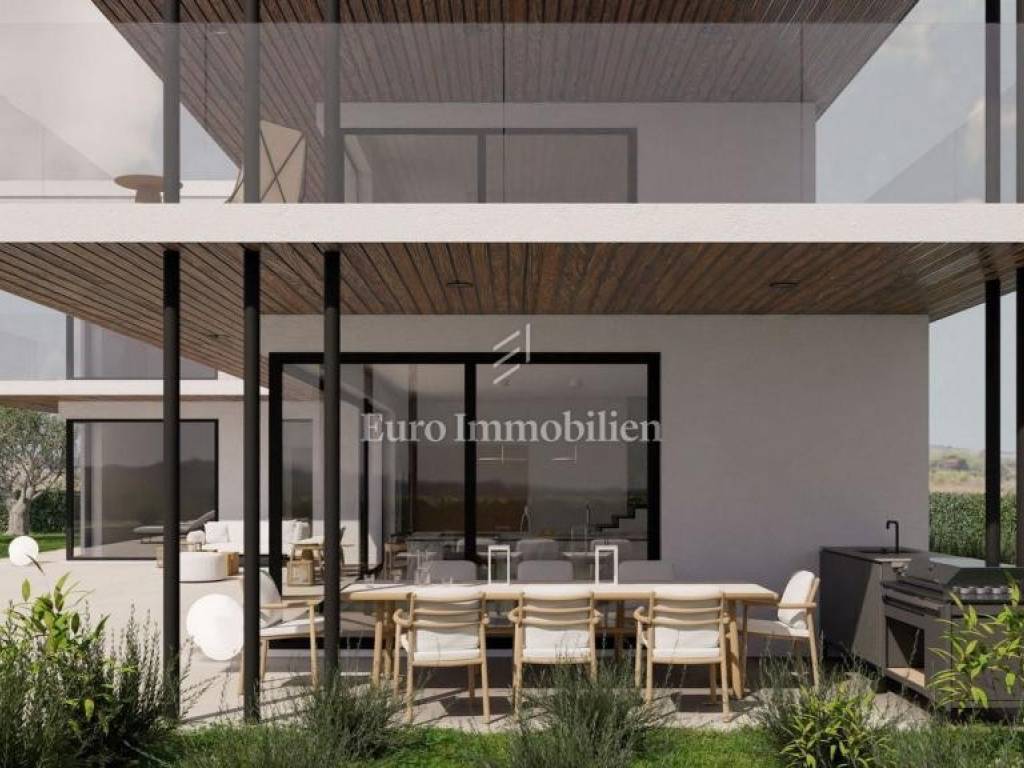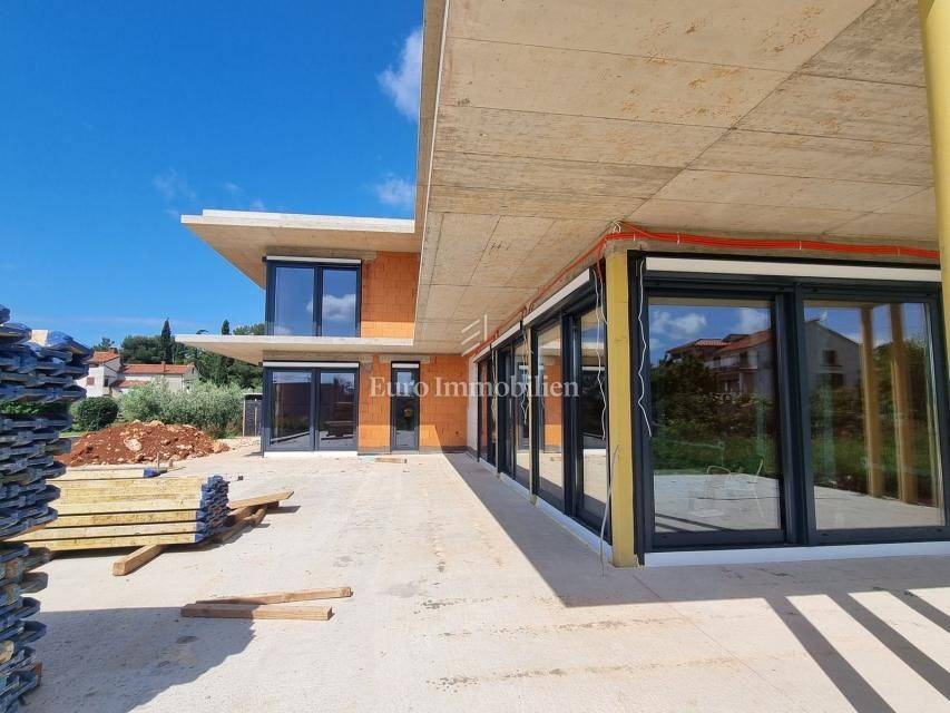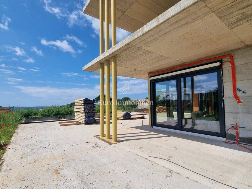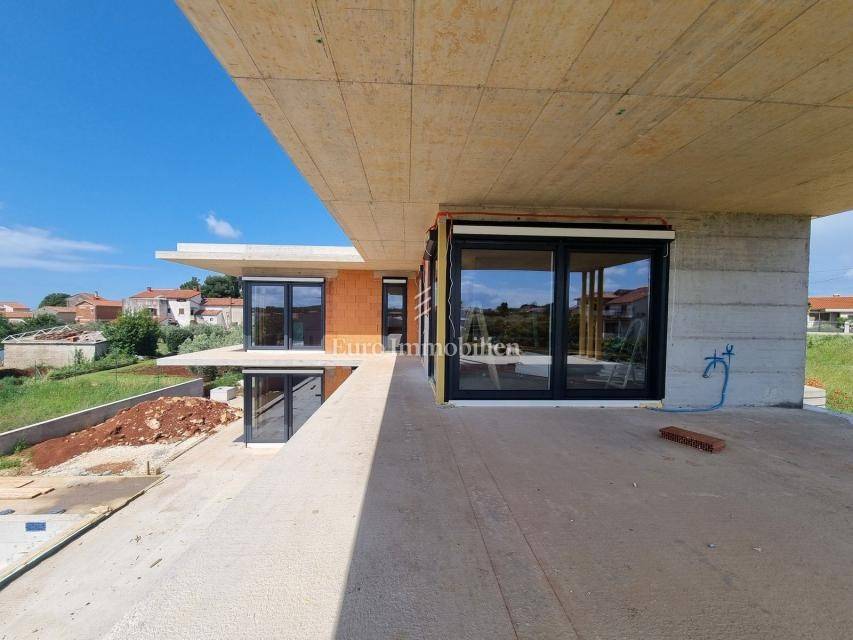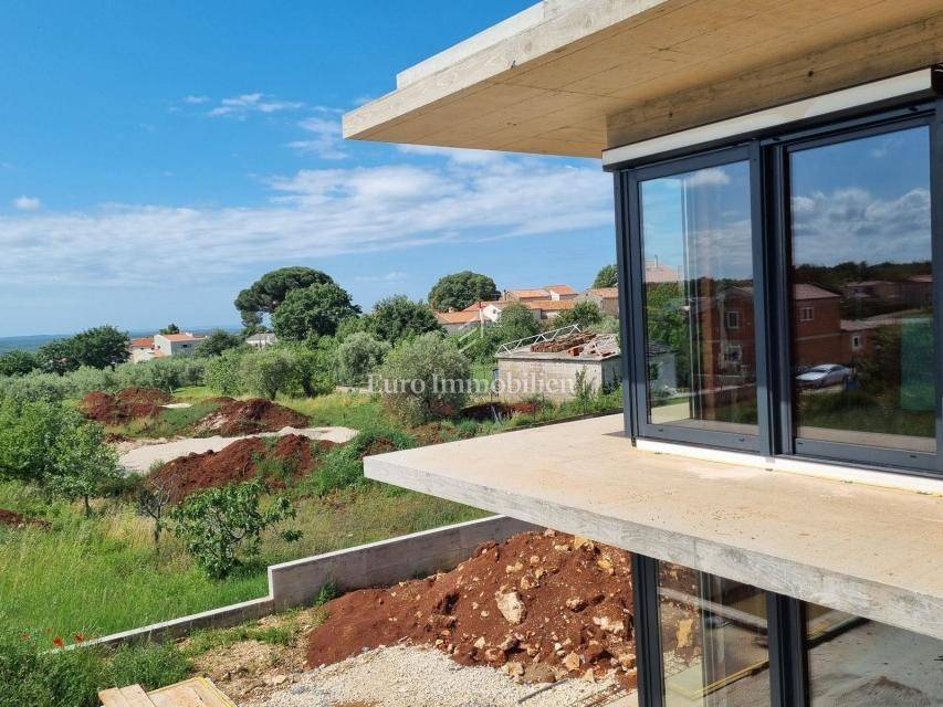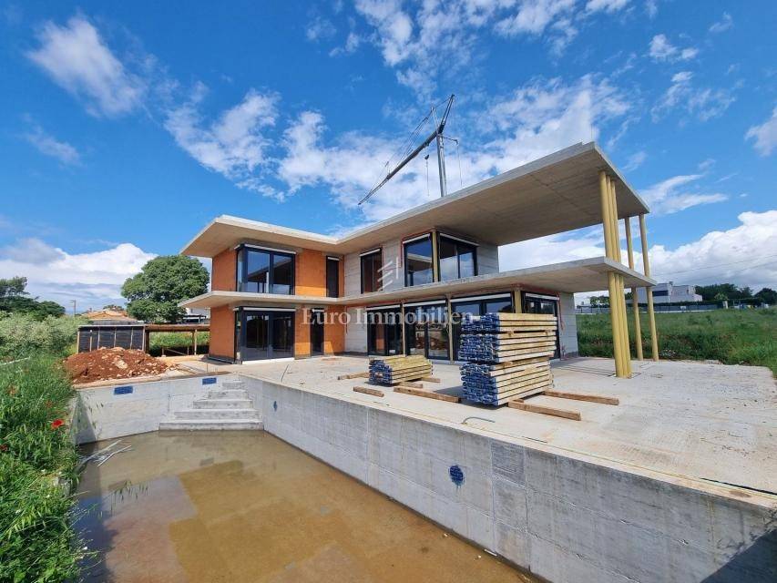 A beautiful villa of modern design is for sale, located in a small Istrian town not far from Poreč, only 8 km from the sea. It has a net usable area of 330.50 m2, and is located on a plot of 971 m2. It extends to the ground floor and first floor. On the ground floor there is an entrance hall, a large spacious living room - open space concept that is designed for the kitchen, dining room and living room, one bedroom with its own bathroom, toilet and storage room. The living room and the room have access to the terrace, garden and pool. Internal stairs lead to the first floor where there are three more bedrooms, each with its own bathroom. The master bedroom has access to a spacious covered terrace with a partial view of the sea. A large swimming pool and parking spaces are provided in the garden. The heating is underfloor with a Mitsubishi air-water heat pump, the cooling is a Mitsubishi multisplit. The exterior joinery is aluminum with blinds, mosquito nets and electric lifters. The entrance door is Pivot, while the interior door is Invisible, 2.30 meters high. Ceramics measuring 120 x 230 cm are provided in the bathrooms, and ceramics measuring 12 x 4 cm in the pool. The house is sold with installed ceramics and sanitary ware, installed parquet and ceramic floors, but without furniture.