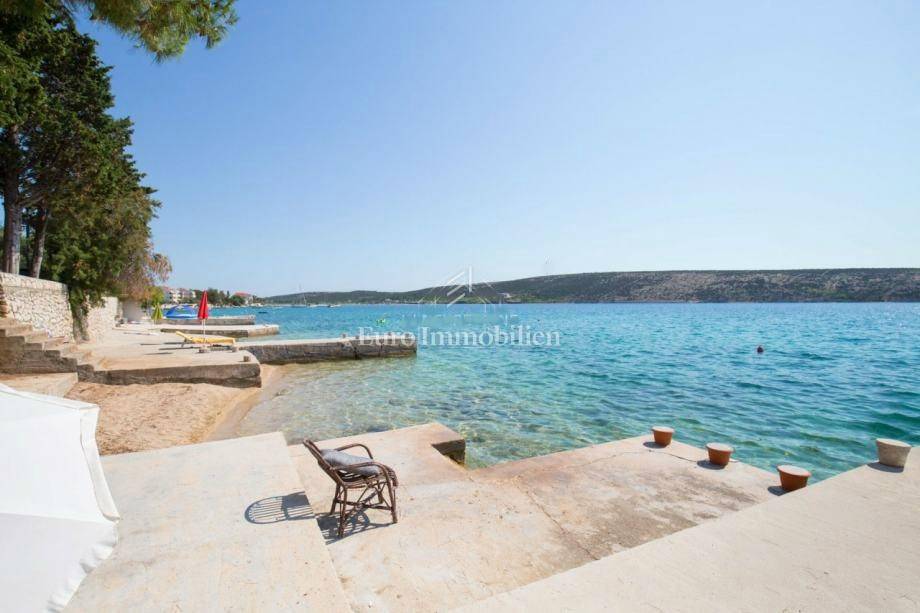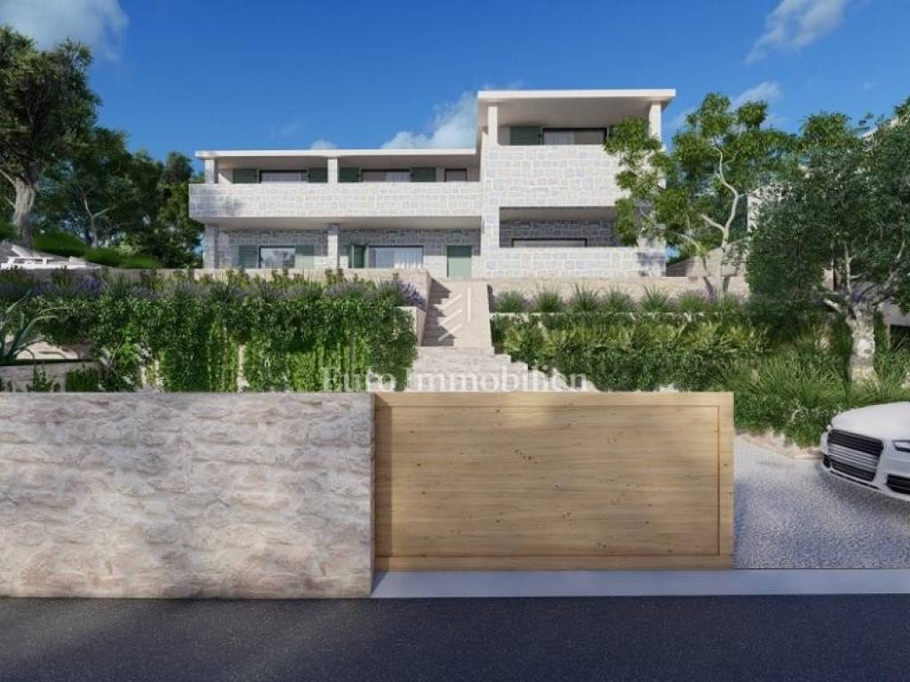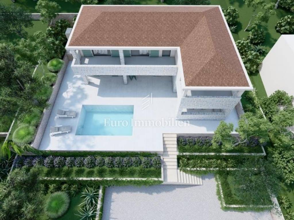On the ground floor there is a bedroom, a bathroom, a living room with a kitchen and dining room, and a summer kitchen with access to a covered terrace and a courtyard with a swimming pool. On the first floor there are 3 bedrooms and 2 bathrooms and a terrace with a sea view. There is parking for four cars on the plot. Quiet location. Completion of works scheduled for spring 2026.