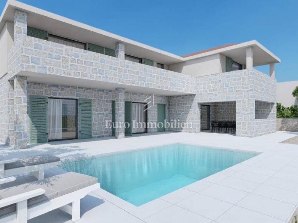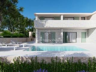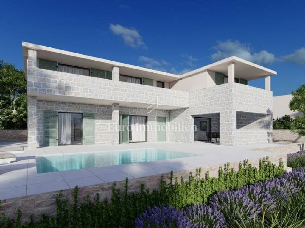 A villa with a swimming pool under construction in Stara Novalja on the island of Pag is for sale, with an area of 227 m2 and two floors. It is spread over a plot of 650 m2 and has a beautiful sea view. It is only a few minutes walk from the nearest beach, as well as the beautiful promenade along the sea.