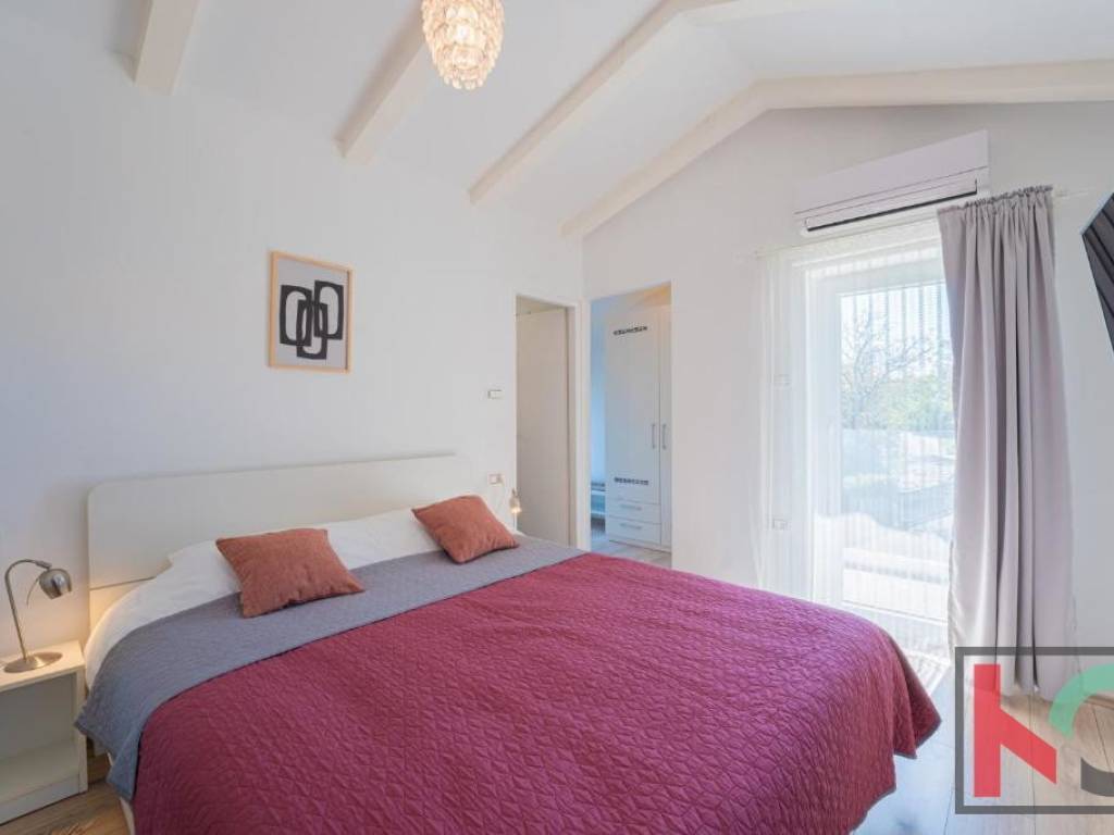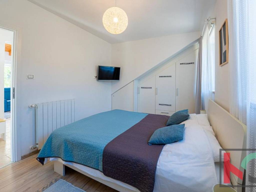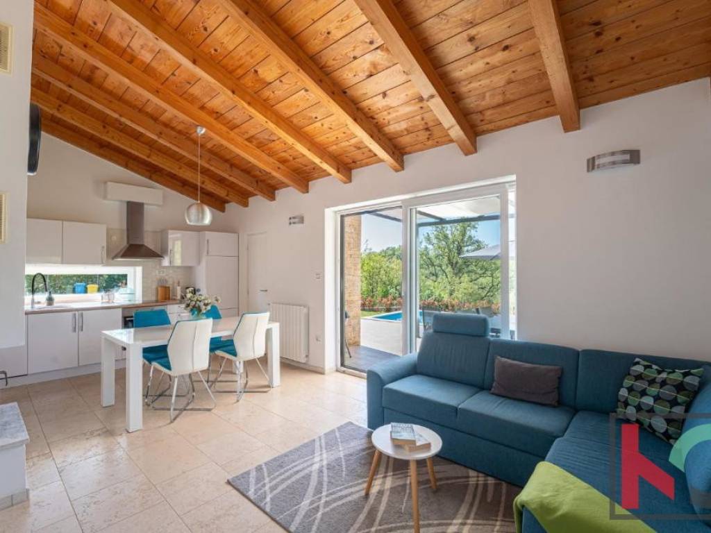 Kuća se prostire na prostranoj parceli ukupne površne od 781 m2, s lijepim pogledom na okolnu prirodu. U prizemlju se smjestio prozračan dnevni boravak s izlazom na terasu, potpuno opremljena kuhinja, blagovaonica, spremište, toalet za goste i jedna spavaća soba sa vlastitom kupaonicom. Unutarnjim stepeništem dolazi se na prvi kat sa još jednom spavaćom sobom koja također ima vlastitu kupaonicu, garderobu i lođu. Posebnost prostora su detalji od prirodnih materijala – drvo i kamen – koji prostoru daju toplinu i domaći ugođaj. Grijanje i hlađenje prostora osigurano je klimatskim jedinicama, a zahvaljujući električnom centralnom grijanju ova kuća pogodna je za boravak tijekom cijele godine. Kamin na drva osim grijanja omogućava dodatni ugođaj i stvara toplinu doma.