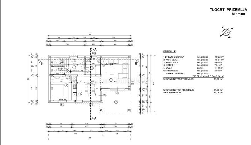 The ground floor consists of an open-plan living room, kitchen and dining area, a hallway, a bathroom, one bedroom and a storage room, as well as a spacious covered terrace.