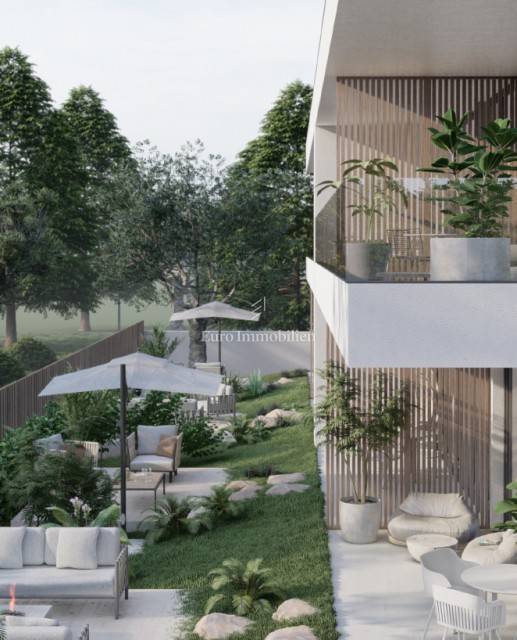 A modern and elegantly designed ground-floor apartment in a new building is for sale, with a total area of 66.50 m², a terrace of 10.34 m², and a private garden of approximately 35 m².