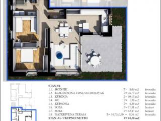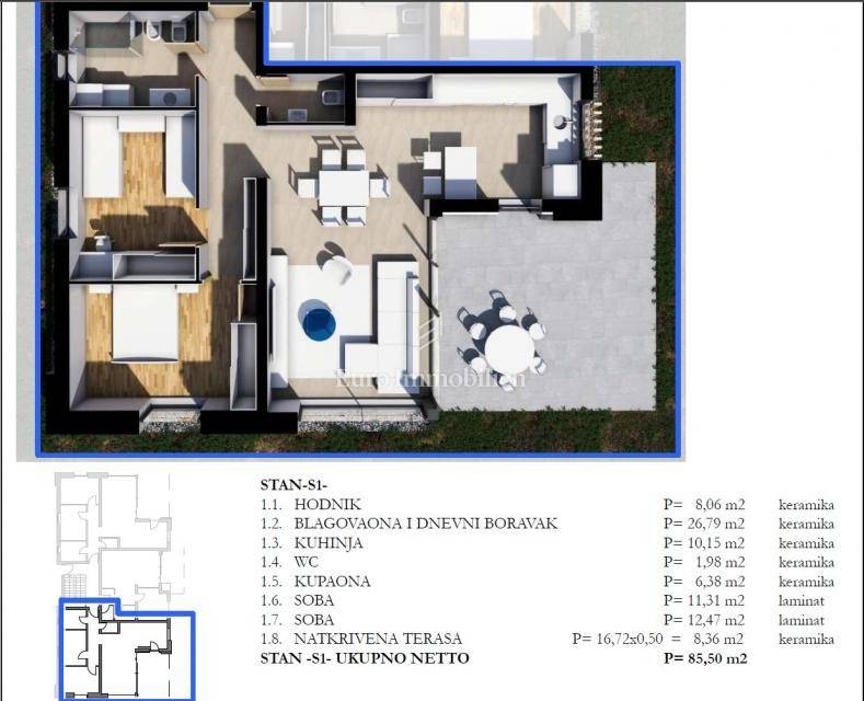 The apartment has area of 85.50 m² and consists of an open-plan kitchen, dining area and living room, a hallway, a separate guest toilet, a bathroom, two bedrooms, and a covered terrace.