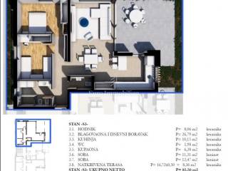 The apartment has area of 85.50 m² and consists of an open-plan kitchen, dining area and living room, a hallway, a separate guest toilet, a bathroom, two bedrooms, and a covered terrace.