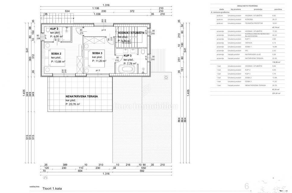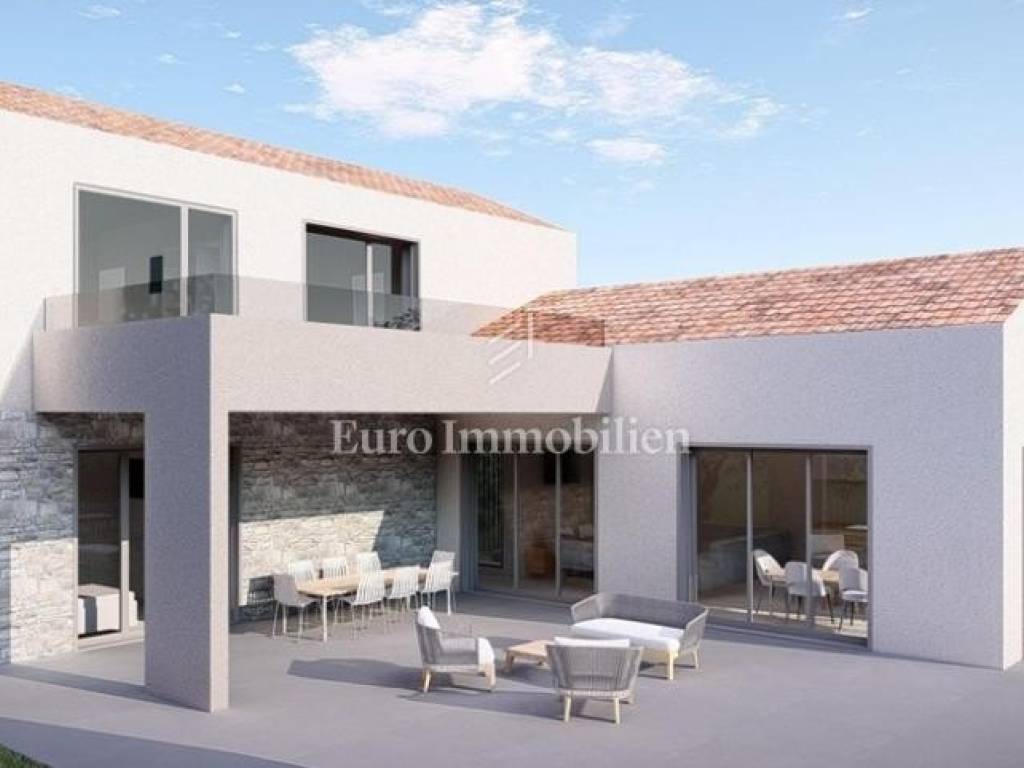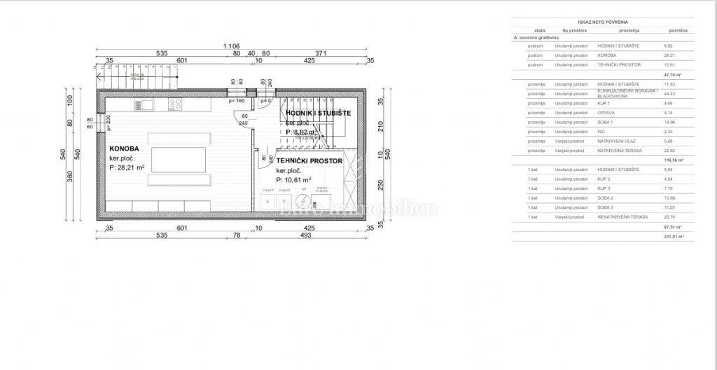 Idejnim projektom predviđena je izgradnja kuće ukupne površine 180 m², koja se sastoji od podruma, prizemlja i prvog kata. U podrumu su smješteni konoba i tehnički prostor. Prizemlje obuhvaća spavaću sobu, kupaonicu, WC, ostavu te kuhinju s blagovaonicom i dnevnim boravkom. Na katu se nalaze još dvije spavaće sobe, svaka s vlastitom kupaonicom, kao i nenatkrivena terasa.