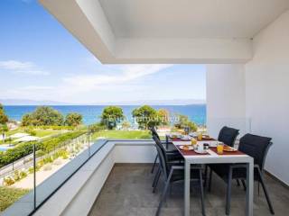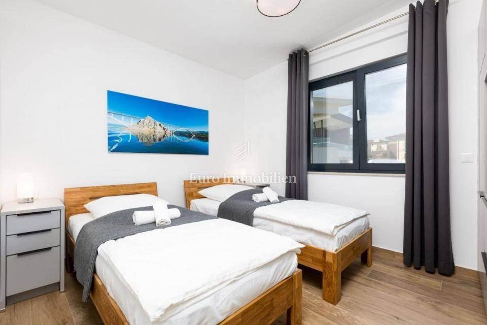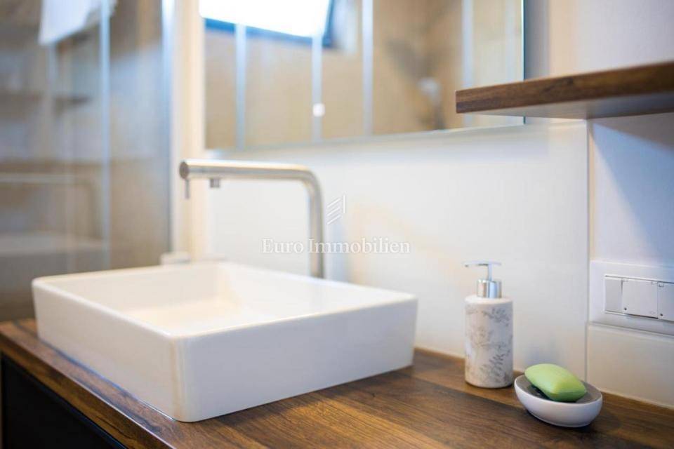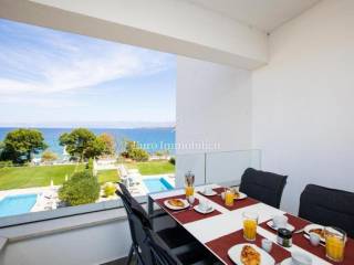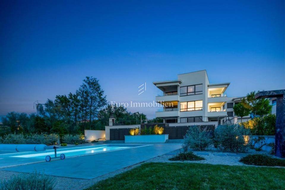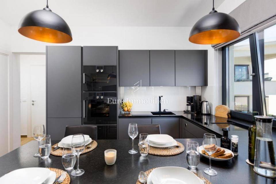 Island of Krk, Malinska - Apartment in the first row to the sea in one of the best locations in Croatia! The apartment of 81.42 m2 is located on the second floor of a superb apartment villa with a total of 6 apartments built in 2020. It consists of a spacious living room with a kitchen and dining room, two bedrooms, a bathroom, a toilet, a hallway, a storage room and a covered balcony. It is fully furnished and equipped with top quality furniture and equipment. The apartment has a beautiful, open view of the sea. It has one parking space. In the common garden there is a heated swimming pool with a sunbathing area, a barbecue and a staircase that leads directly to the beach. A rare and prestigious location on the market!