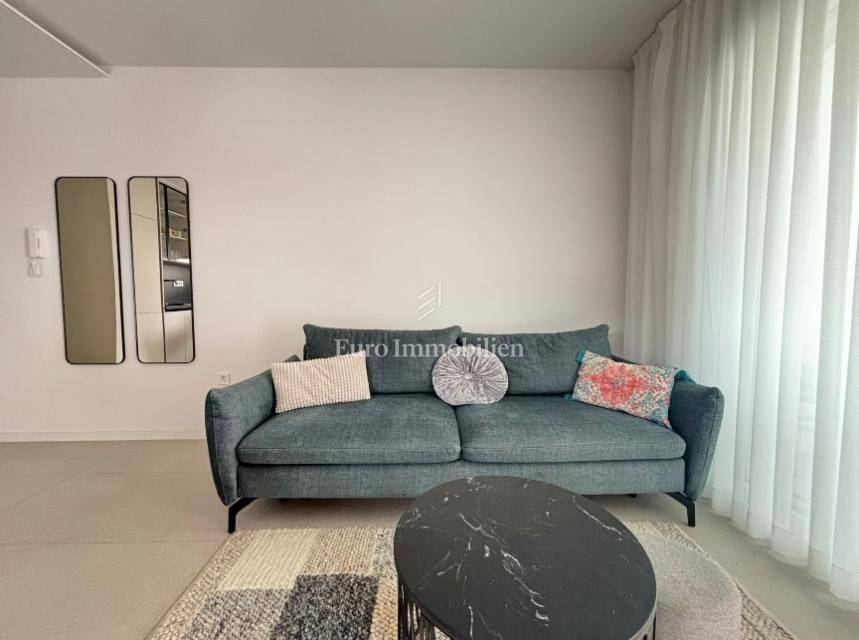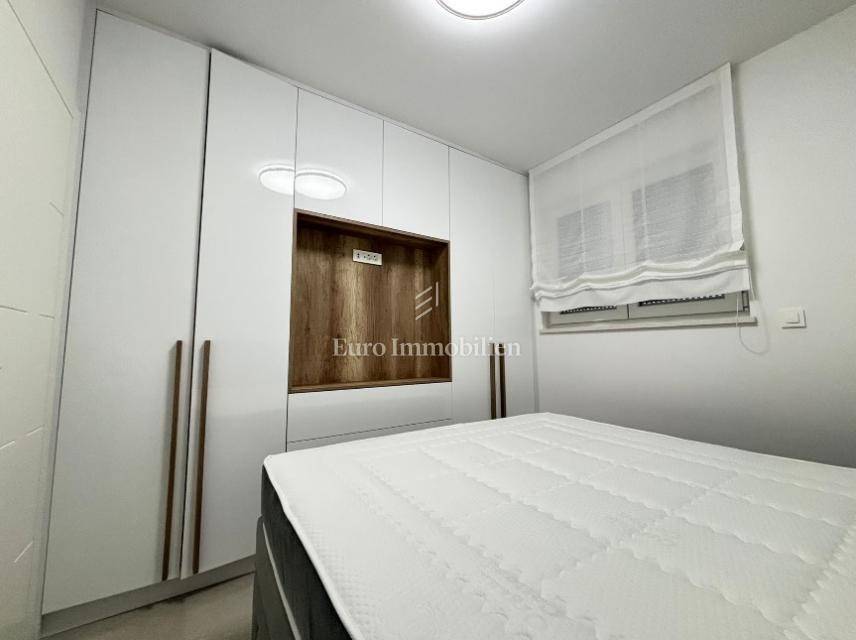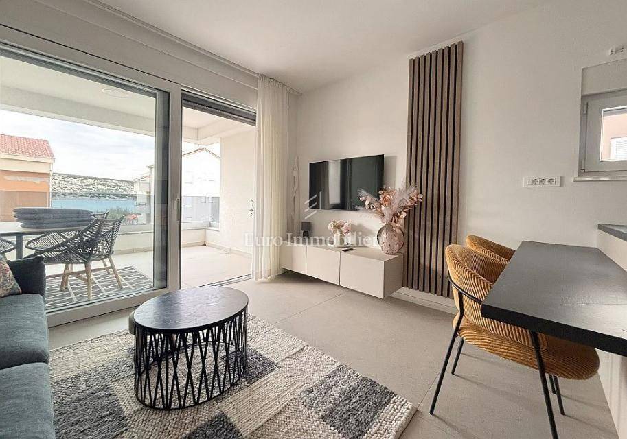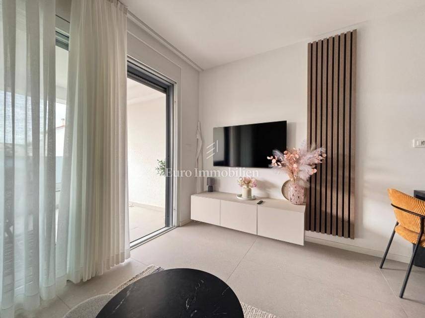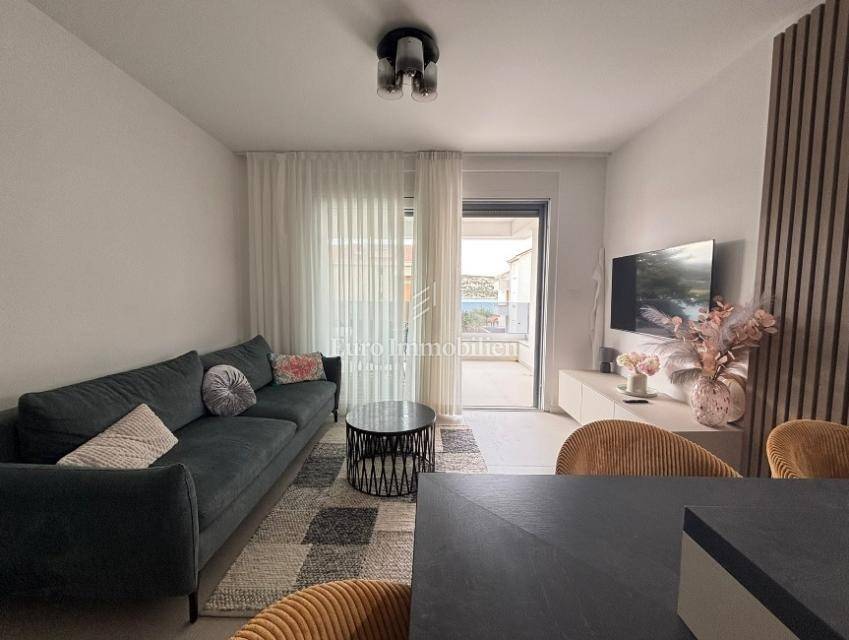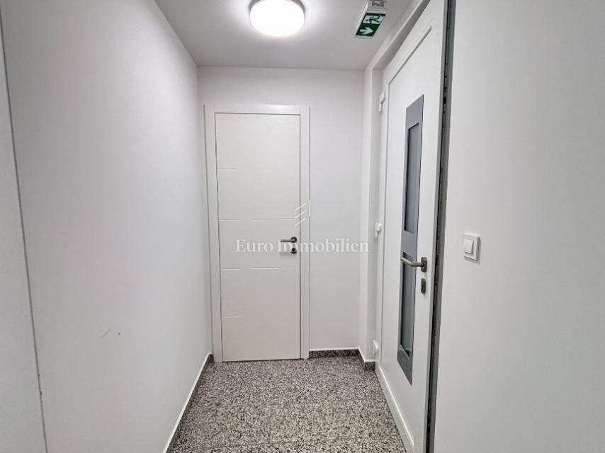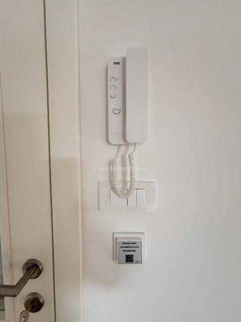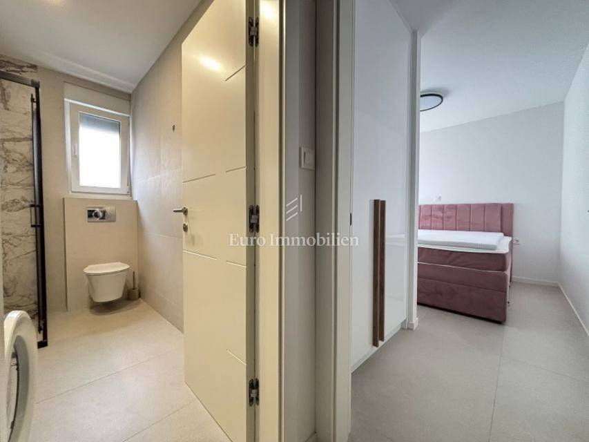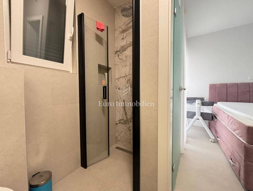 The apartment consists of a living room with kitchen, two hallways, two bathrooms, two bedrooms, and two terraces (usable areas of 9.26 m² and 2.05 m²) with a sea view. It also includes a storage room on the ground floor with an area of 2.01 m². The apartment is air-conditioned and furnished, and it features underfloor heating in the bathrooms, a security door, and an intercom system.