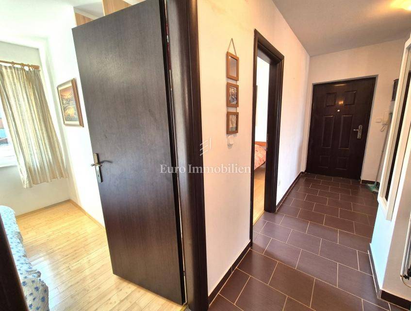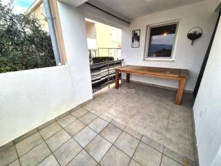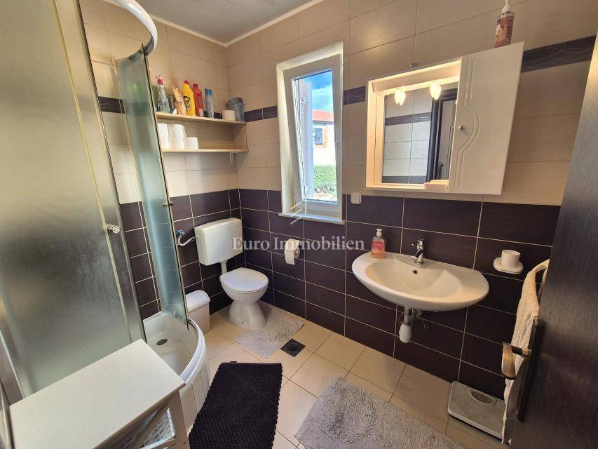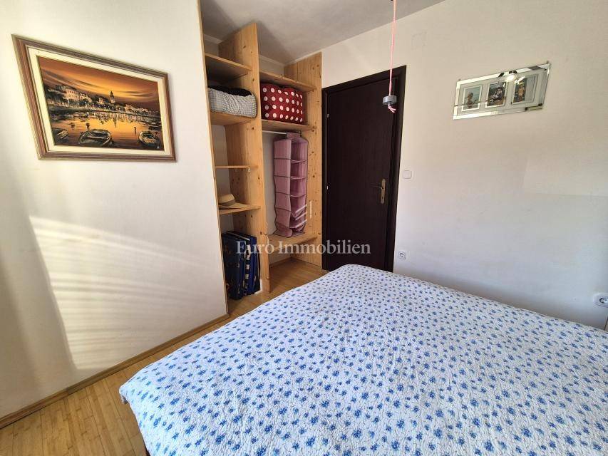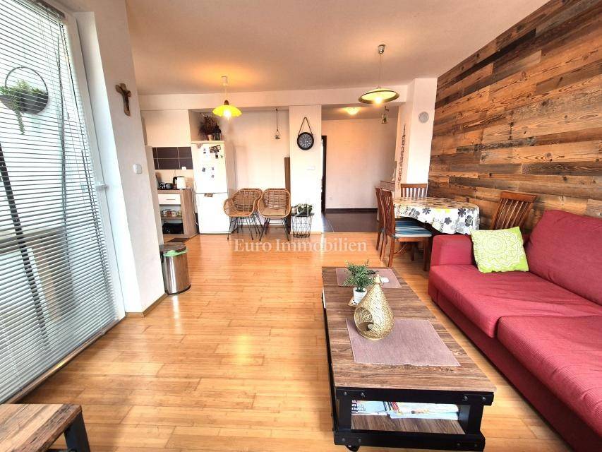 The apartment with a total area of 75.32 m² is located on the high ground floor of a newer residential building. It consists of an entrance hall, bathroom, two bedrooms and an open-space kitchen, dining room and living room with access to a covered terrace. The terrace offers a great view of the sea. The apartment also includes a storage room in the basement of the building with an area of 9.15 m2, as well as one parking space in the common part of the garden. The apartment is air-conditioned, has PVC joinery and is ready to move in immediately. Quiet location next to a green area, furniture by arrangement!