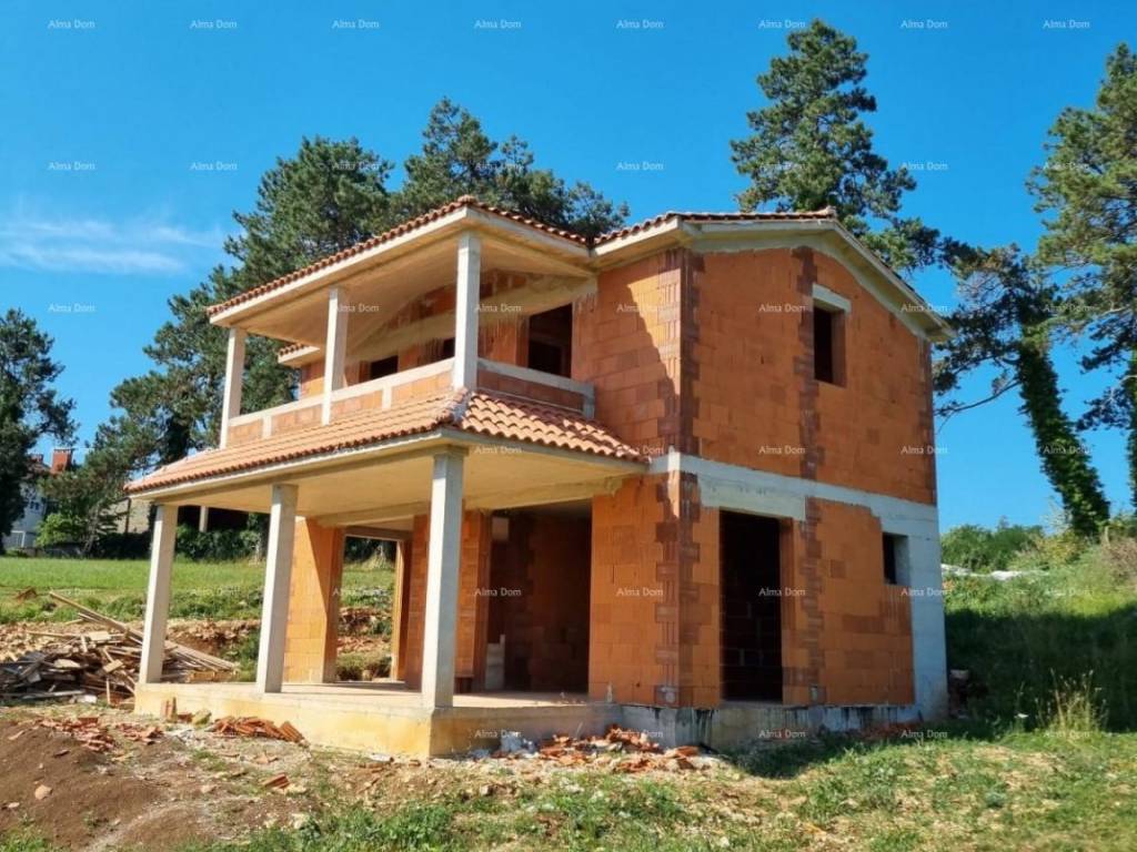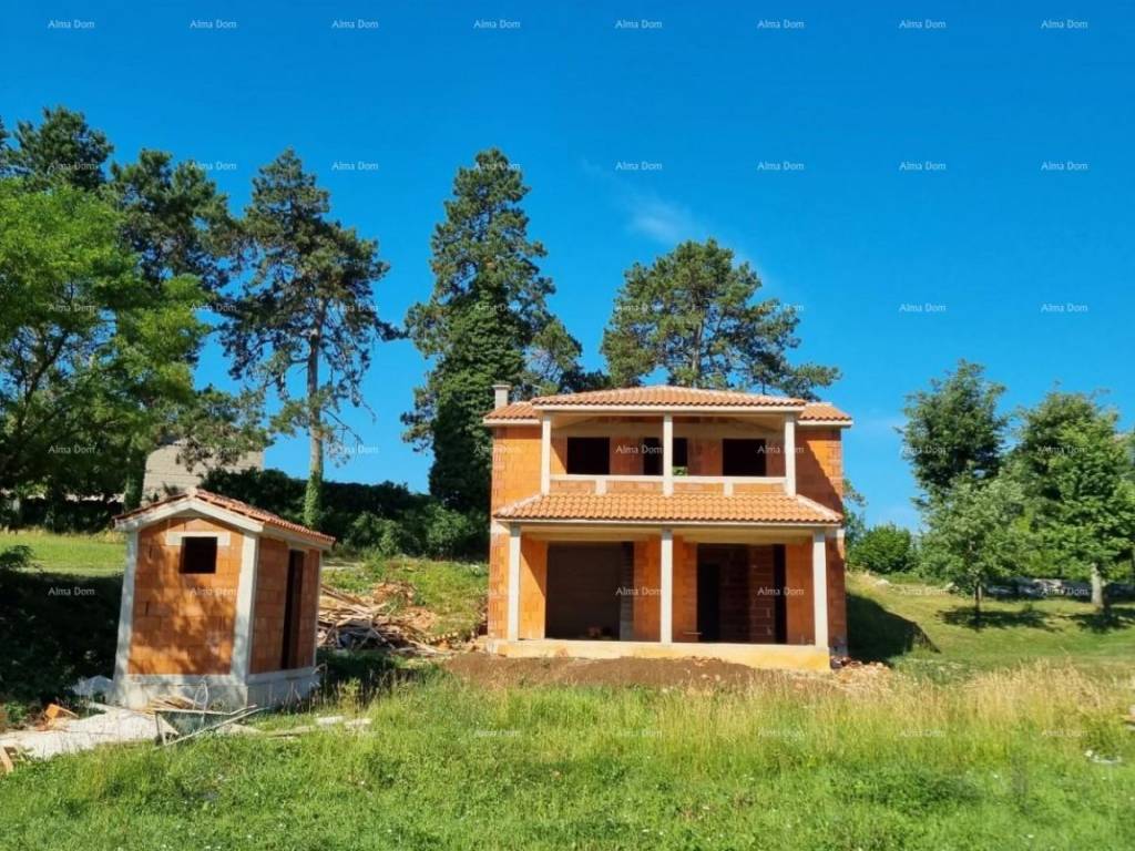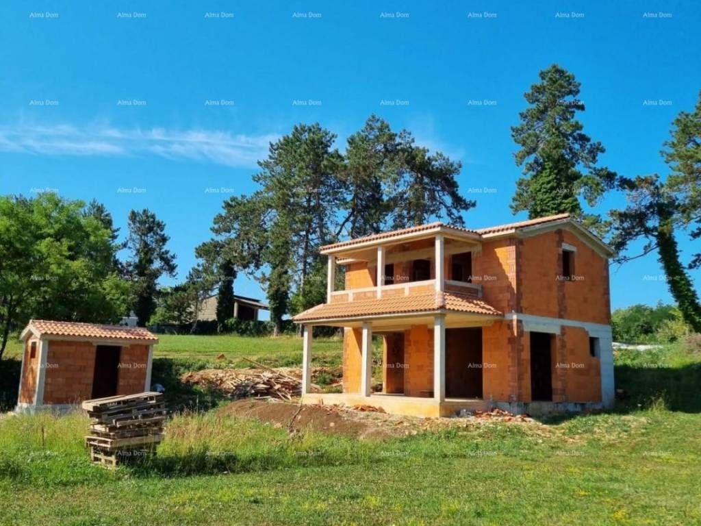 For sale a detached house in the Roh-Bau phase, Pazin area. For sale a roh-bau house with a swimming pool, gross area of 150 m, net area of 120 m, located on a plot of 911 m. The house is two-storey and consists of: Ground floor: Living room Kitchen Pantry Technical room Bathroom Covered terrace. First floor: Two bedrooms Two bathrooms Large terrace with a view. The house comes with a swimming pool and a smaller building that can be used as a storage room.