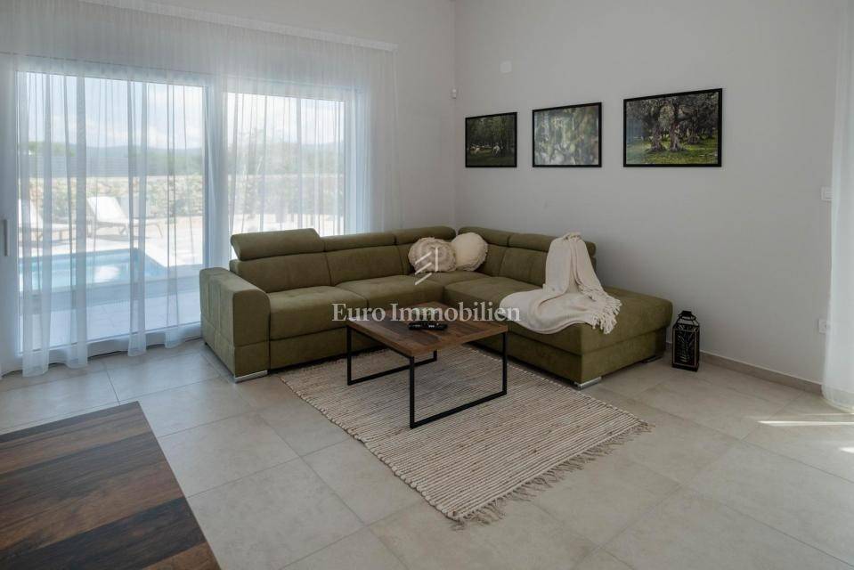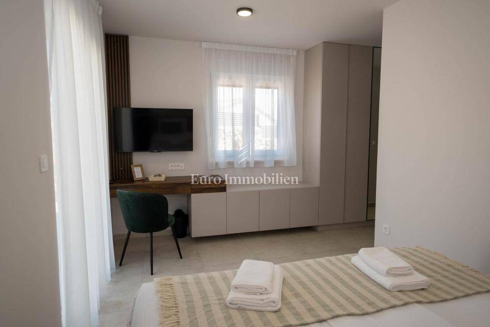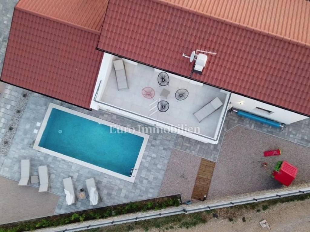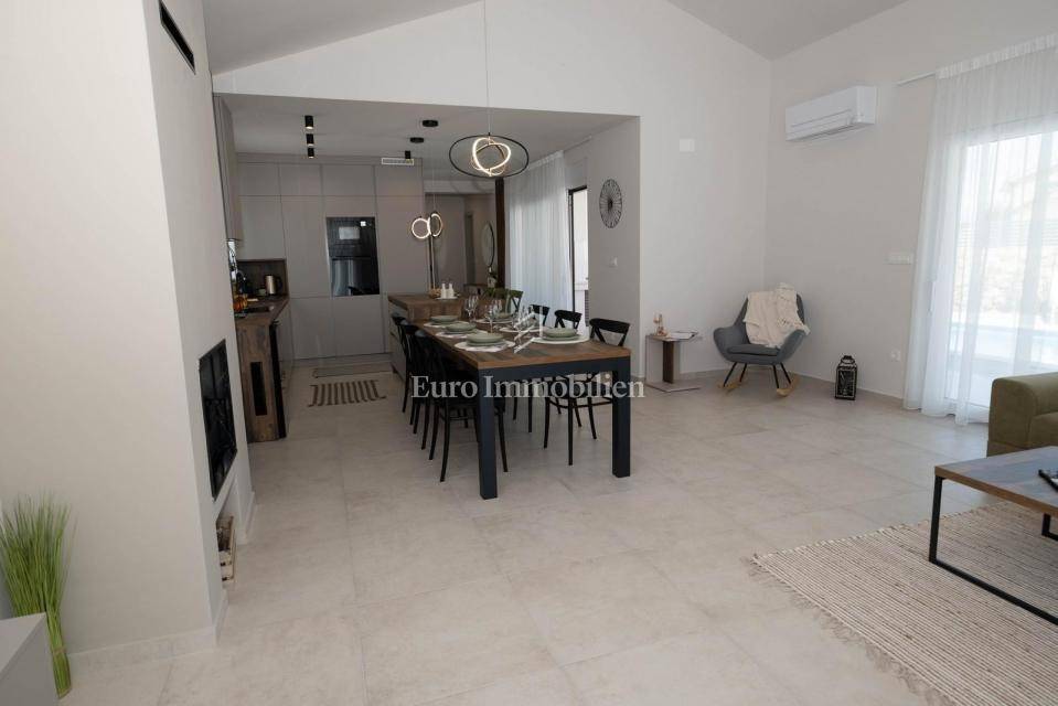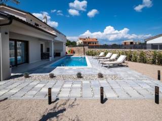 The residential part of the villa stretches over the ground and the first floor. On the ground floor is an entrance hall, a bedroom with a bathroom, a kitchen with a dining area, a living room, a toilet and a storage room. Two bedrooms and two bathrooms, as well as a spacious terrace are located on the first floor. In the landscaped garden is a heated swimming pool and a covered terrace with a summer kitchen. All rooms in the house are air-conditioned, the house has video surveillance and an alarm, and the garden has automatic irrigation.