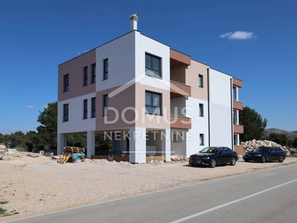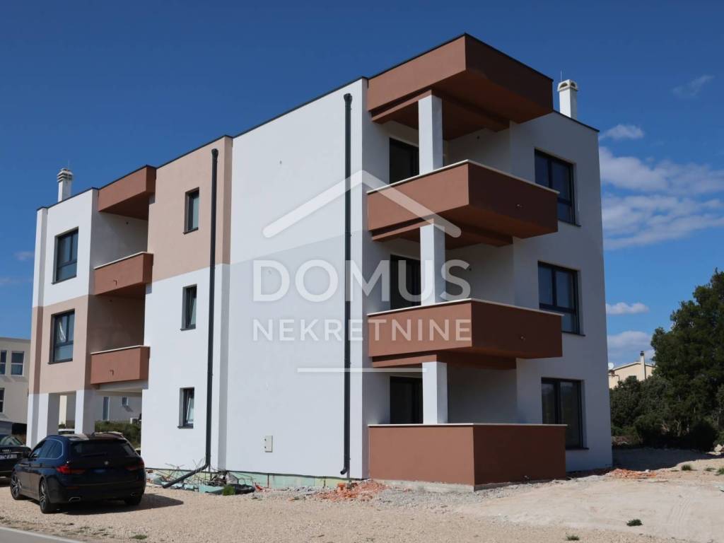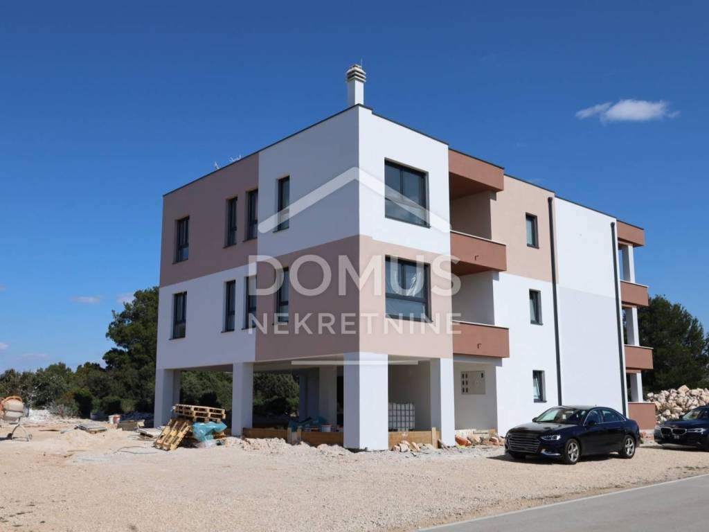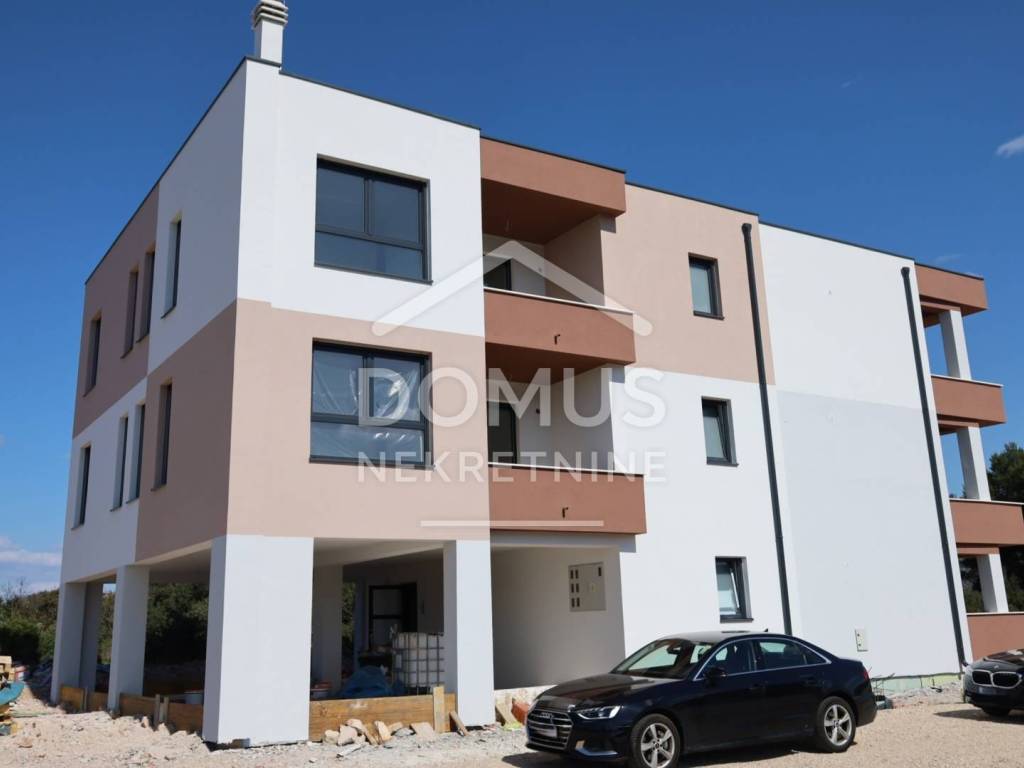 Brodarica, new construction, residential building with 5 units. The building has a total of three floors: ground floor, first floor, and second floor. Modernly designed and equipped with high-quality features: underfloor heating in the bathrooms, air conditioning for heating and cooling in every room, high-quality joinery, windows with electric blinds, insect screens, security doors, and modern bathroom fittings. Expected move-in date: Summer 2026.