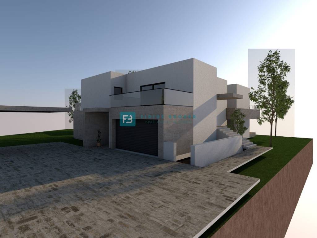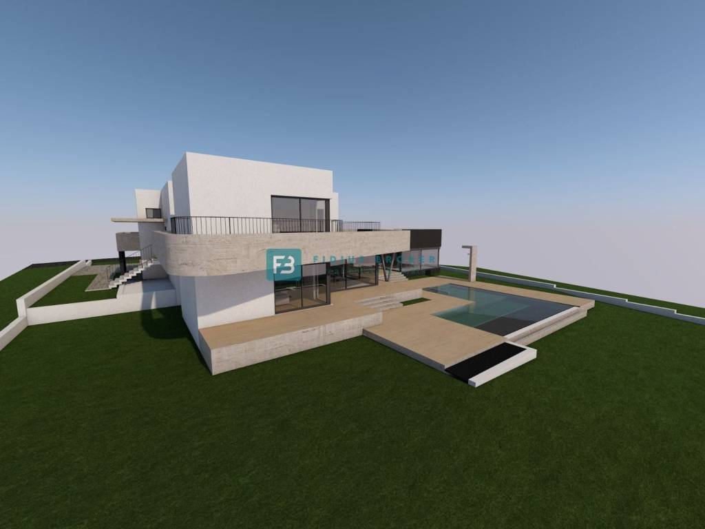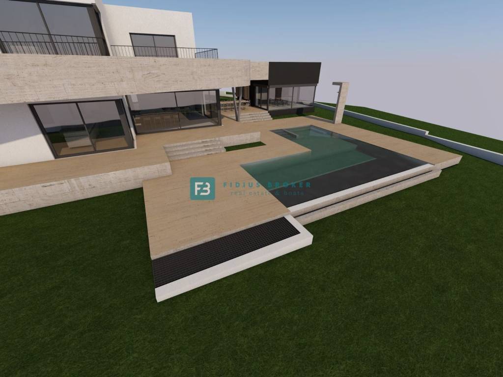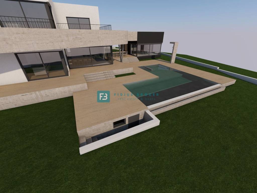 The luxury property extends over three floors (basement + ground floor + first floor) with a total usable area of ​​589.89 m2 + 140.36 m2 terrace, and is located on a spacious plot of 1499 m2. The villa is currently under construction and, according to the project, will be surrounded by beautifully landscaped surroundings. As part of the fenced and paved yard, there will be a large heated swimming pool of 53.19 m², and a sustainable garden with automatic irrigation. The villa will have a partial view of the sea.