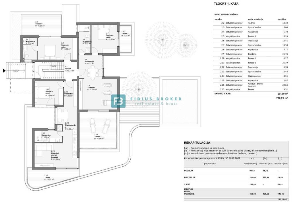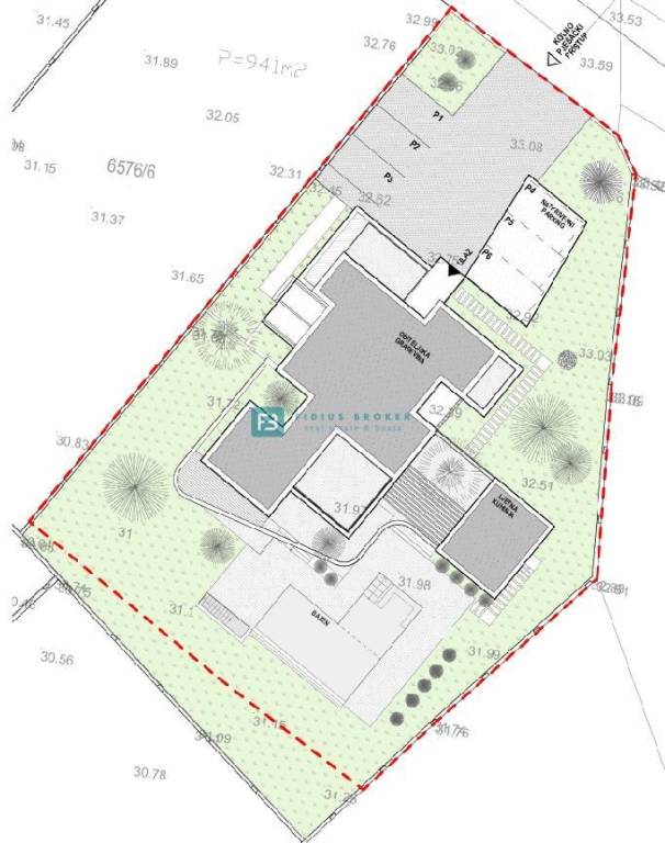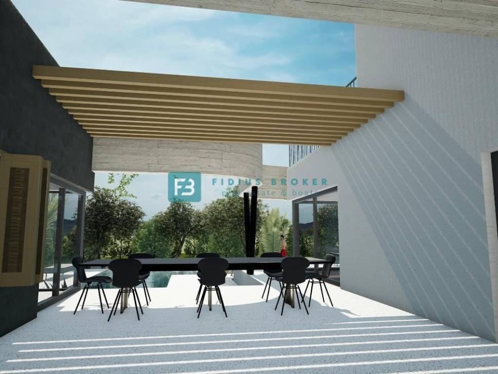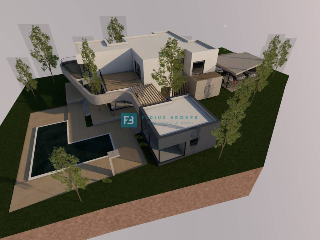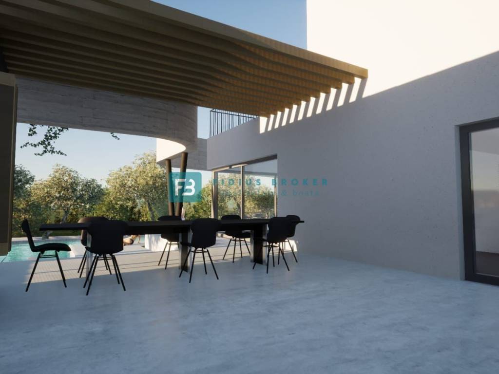 The luxury property extends over three floors (basement + ground floor + first floor) with a total usable area of ​​589.89 m2 + 140.36 m2 terrace, and is located on a spacious plot of 1499 m2. The villa is currently under construction and, according to the project, will be surrounded by beautifully landscaped surroundings. As part of the fenced and paved yard, there will be a large heated swimming pool of 53.19 m², and a sustainable garden with automatic irrigation. The villa will have a partial view of the sea.