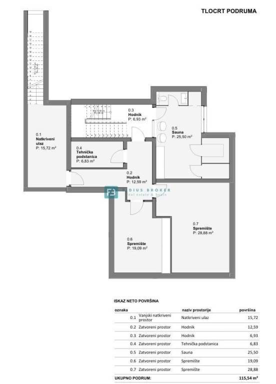 BASEMENT: covered entrance, technical room, corridor, sauna, wine cellar, two storage rooms