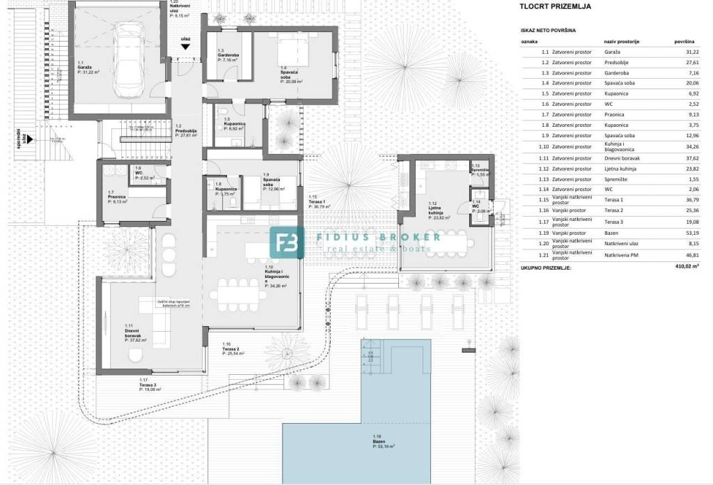 GROUND FLOOR: garage, 6 parking spaces, laundry room, toilet, two bedrooms with bathrooms, dressing room, kitchen with dining room and living room with access to three terraces, spacious heated swimming pool (53.19 m²), sun deck and summer kitchen