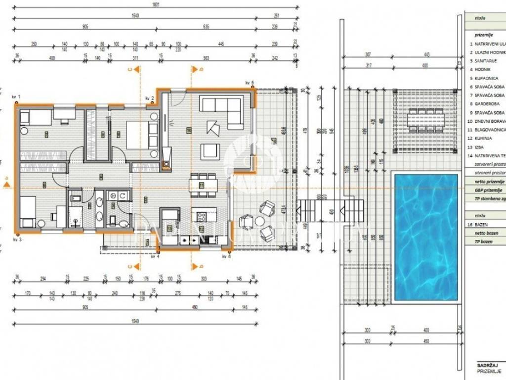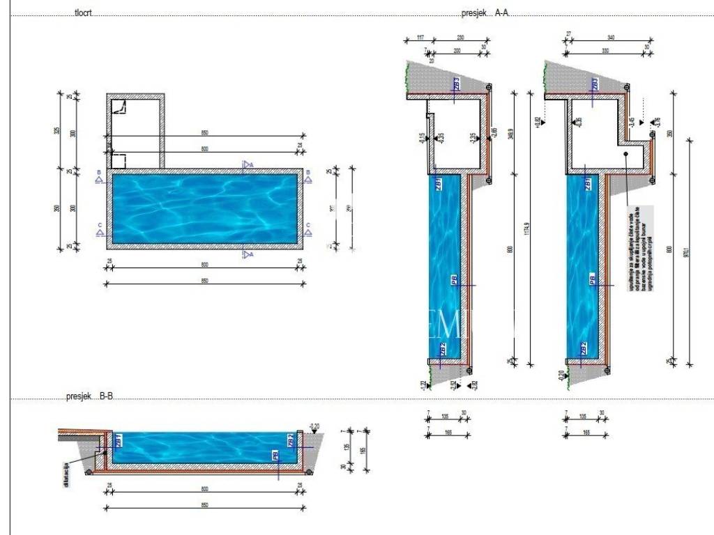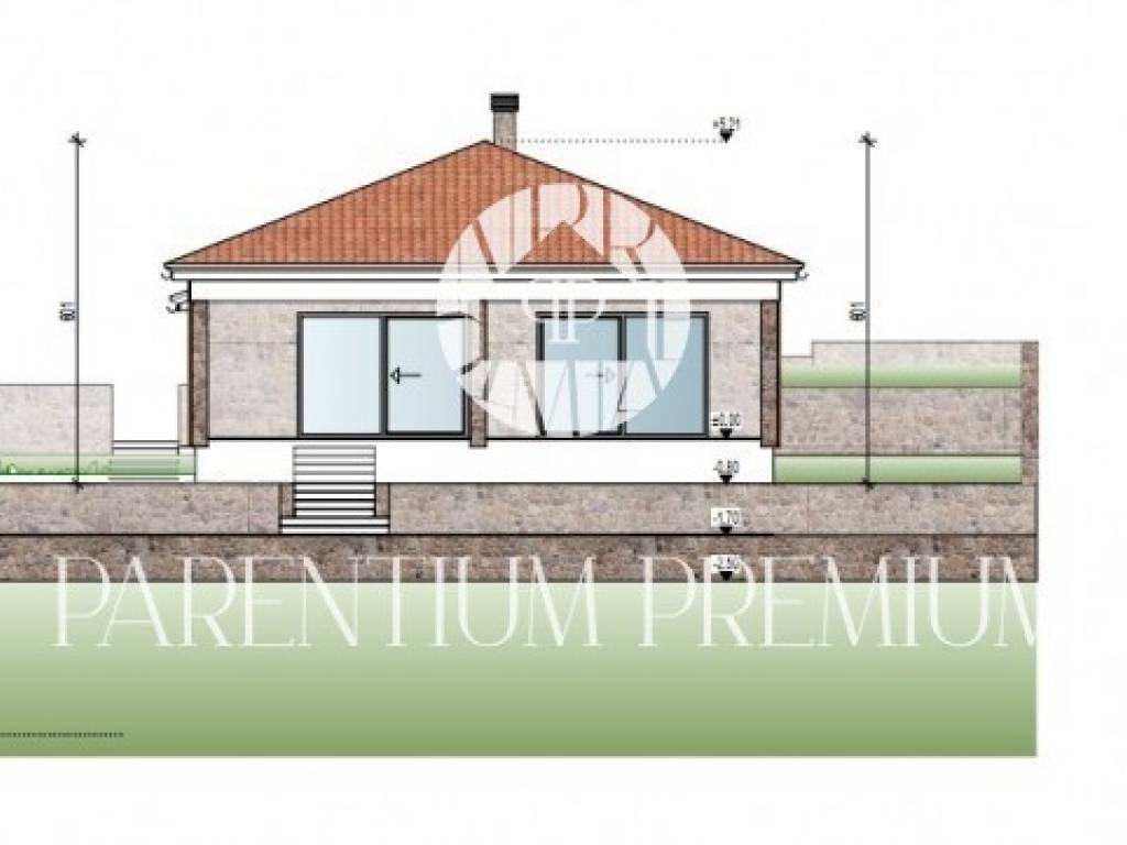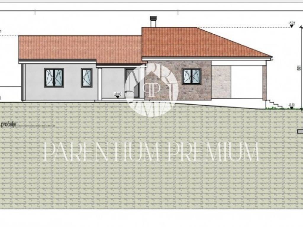 Prodaje se atraktivno građevinsko zemljište sa projektom i panoramskim pogledom na Istarski krajolik. Zemljište ima 1449m2, sva voda i struja se nalaze uz zemljište. U projektu je prizemnica 127.65m2 sa bazenom od 38.25m2. Ovo zemljište sa projektom je idealno rješenje za izgranju vlastitog doma ili kao investicija kuće za odmor.