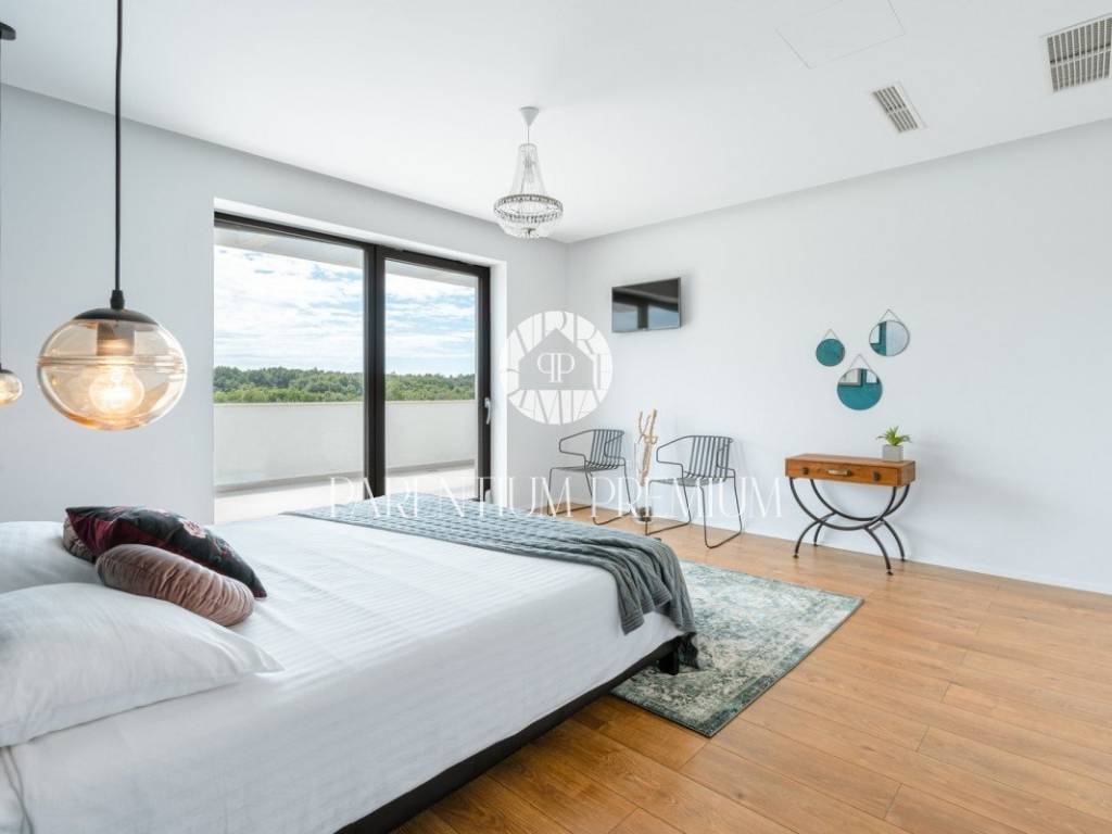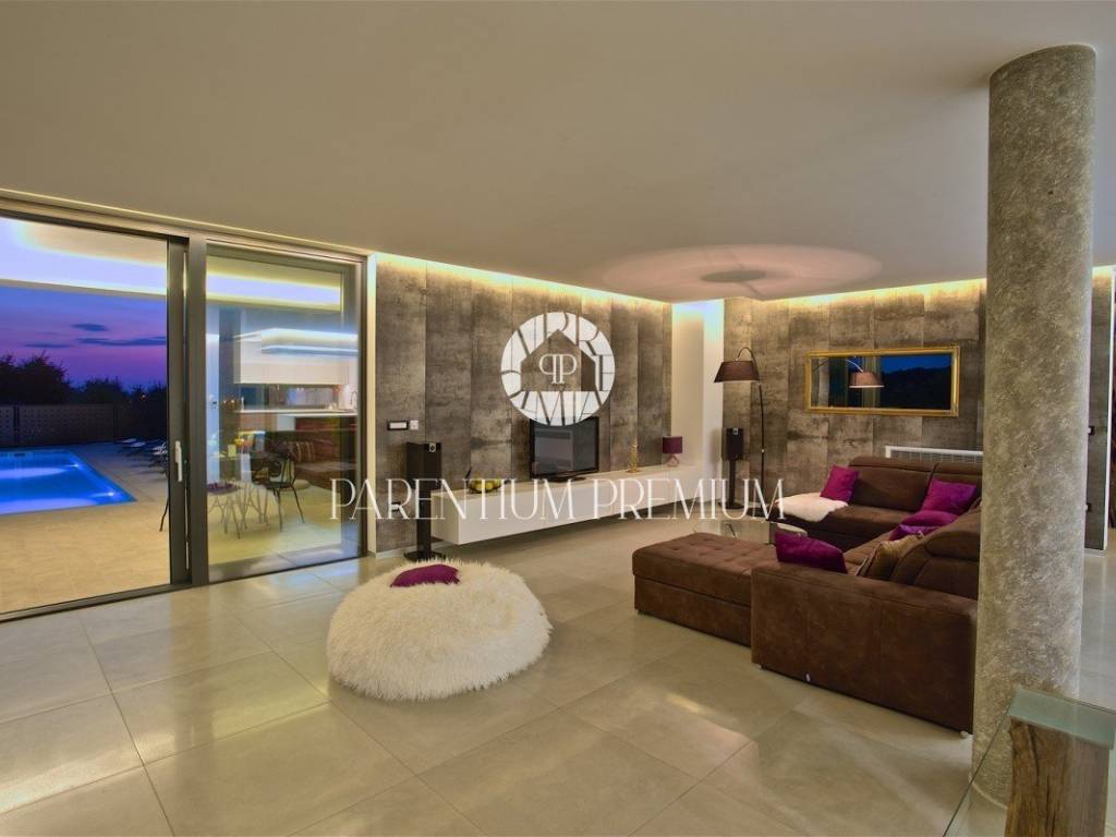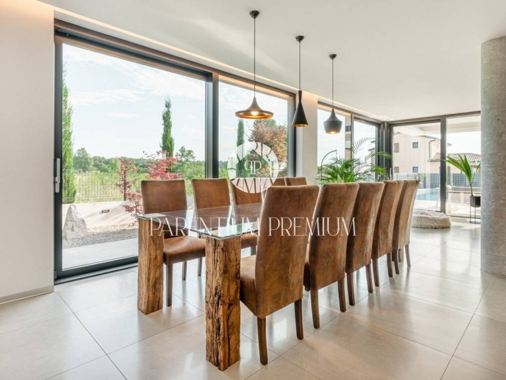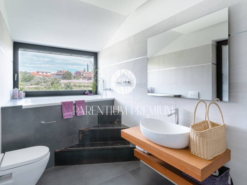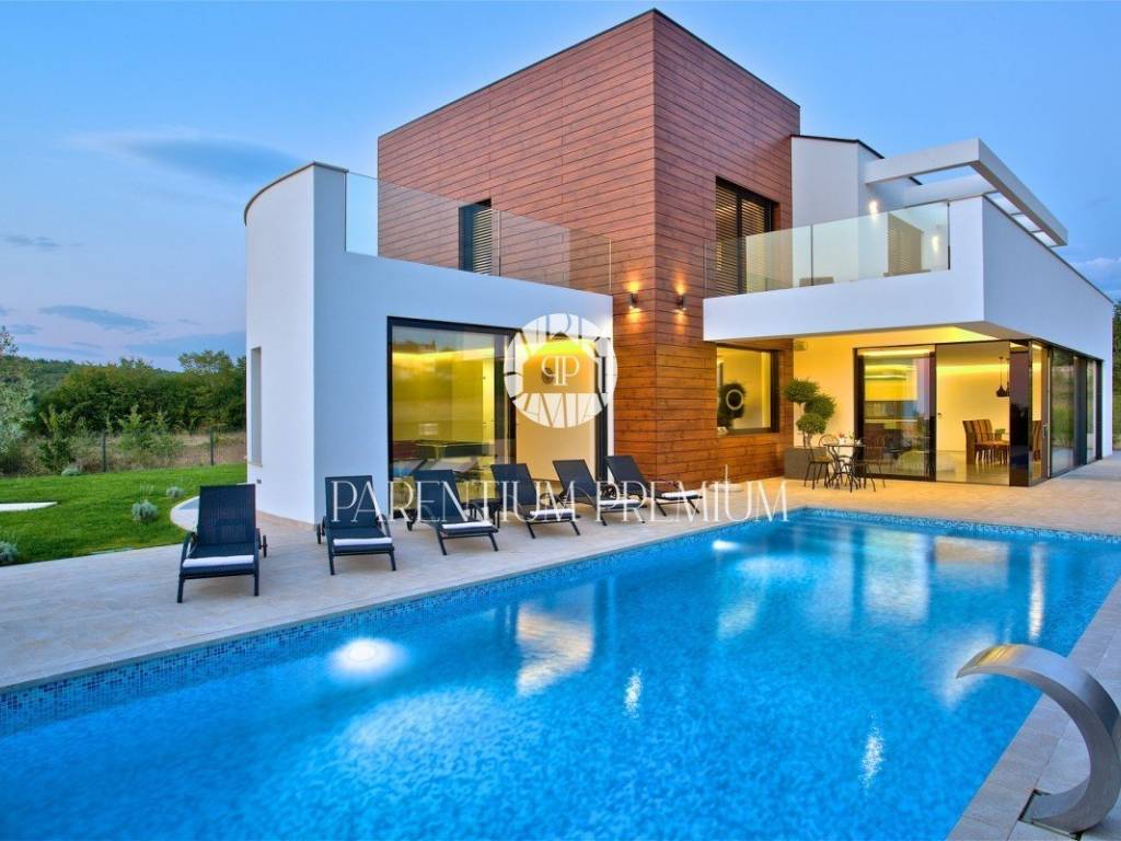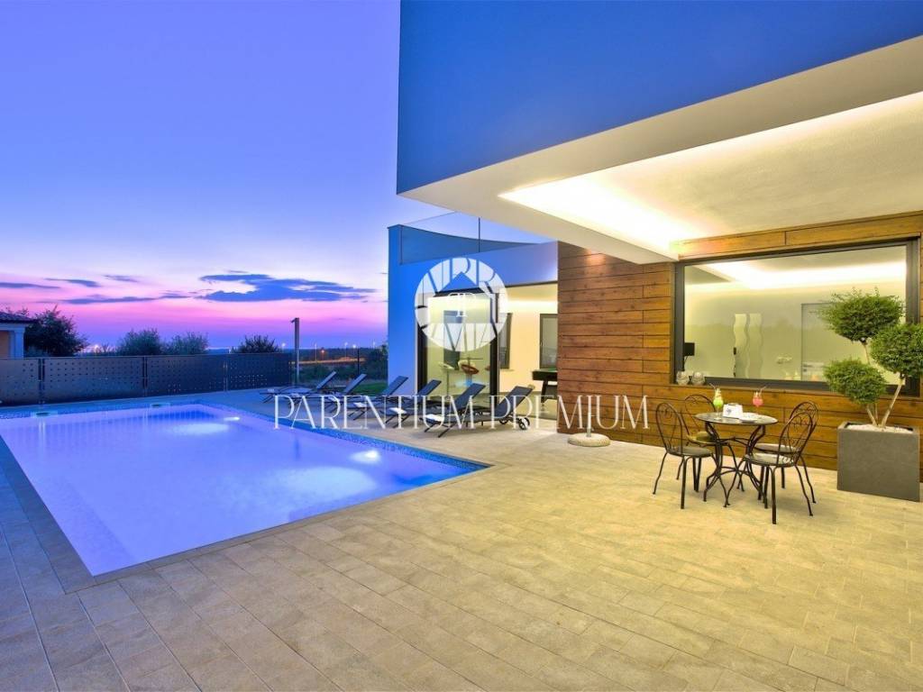 In the vicinity of the city of Porec, in a place with all amenities such as shops, post office, bank, school, kindergarten, etc .., is located this luxury villa of modern design with a living area of 217m2 and land of 410m2.
