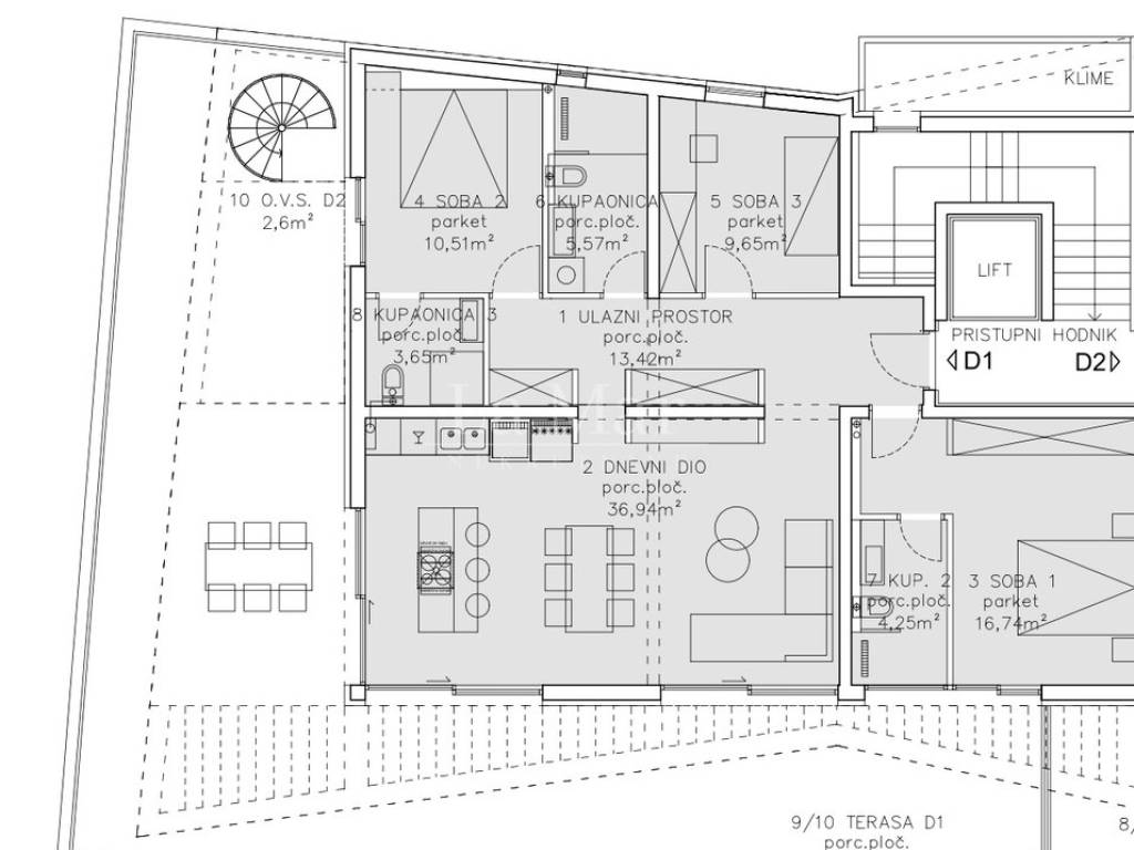 Terase su izvedene s dvostrukom hidroizolacijom, integriranim odvodnim kanalima i staklenim ogradama.