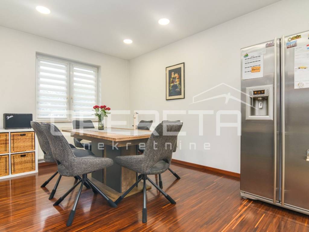 Kuća se prostire na 182 m kroz prizemlje i kat, povezane unutarnjim stepeništem, te funkcionira kao jedna cjelina.