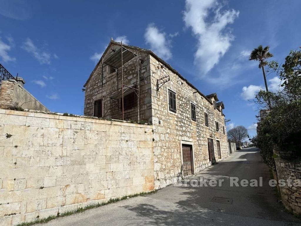 For sale is an old stone house on the island of Brač on a plot of land of 550 m2. It consists of a total of 462 m2 of living space, has three floors and there is an additional smaller building on the plot of approximately 40 m2. It is a traditional stone house with a rich history, over 200 years old. The house has a tavern with a ceiling over 3 meters high, and there is an additional smaller building in the garden. Renovation is needed, however, we can point out the excellent location as the main advantage. The house is dilapidated and needs a complete renovation, which includes the roof, installations, walls and floors, which offers the possibility to renovate it according to one’s own wishes and needs. Electricity, water and other infrastructure are available, but their modernization is needed. There is an opportunity to build a swimming pool, parking lot, etc. so if you are ready to embark on a renovation project and are looking for a property with potential, then this property is the right opportunity. It is only 350 meters from the sea by air and is located near all necessary facilities such as restaurants, shops, pharmacy, hospital, etc. It is also a few minutes’ walk from the center of town. A complete renovation would open up the possibility of engaging in tourist rentals, which would ensure a return on investment.