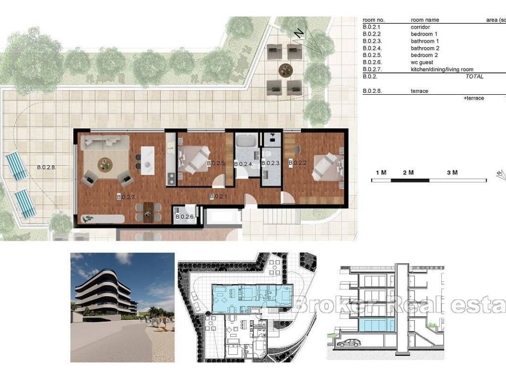 For sale is a luxurious apartment in the first row to the sea with an open view, near the town of Trogir. In a unique location, with a handful of amenities nearby, it ensures absolute privacy and luxury. It is located on the ground floor of a smaller residential building with an elevator and has a southwest orientation. The apartment has 77,49 m² of living space and consists of two bedrooms, two bathrooms, toilet, hallway, kitchen, dining room and living room and a terrace of 74,80 m². The apartment has underfloor heating in the bathrooms and each bedroom and living room have air conditioner. The apartment is sold unfurnished and the parking space in the garage and storage in the basement are charged additionally. In front of the building there is a swimming pool with a sunbathing area, which is intended for the common use of all tenants. The apartment is an excellent opportunity for tourist rental or as a summer home. All necessary amenities are within 500 m and the airport is only 8,5 km away.
