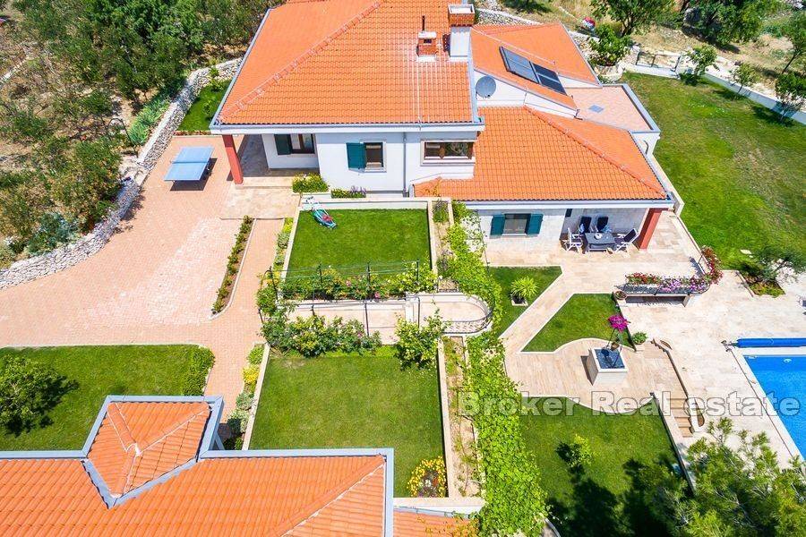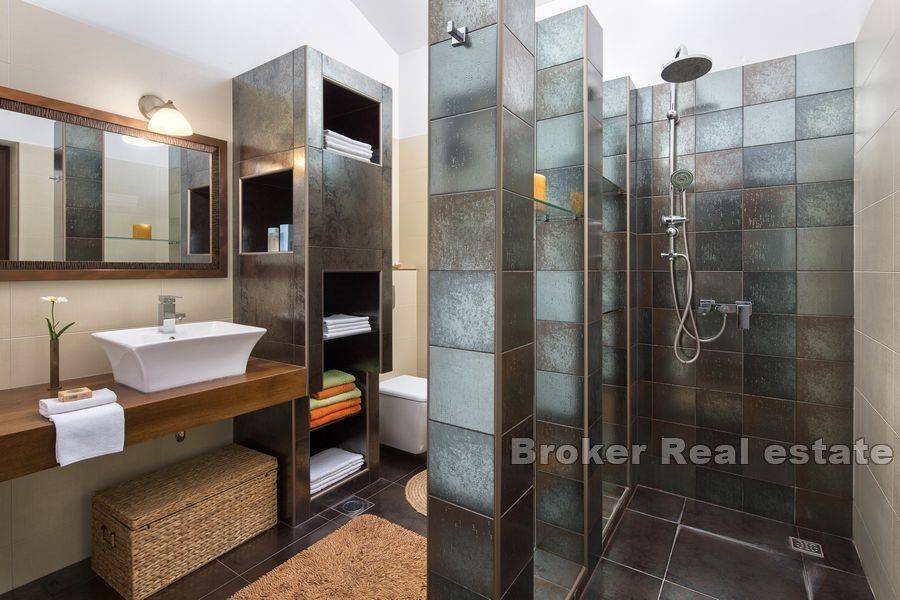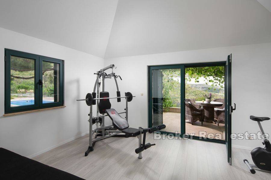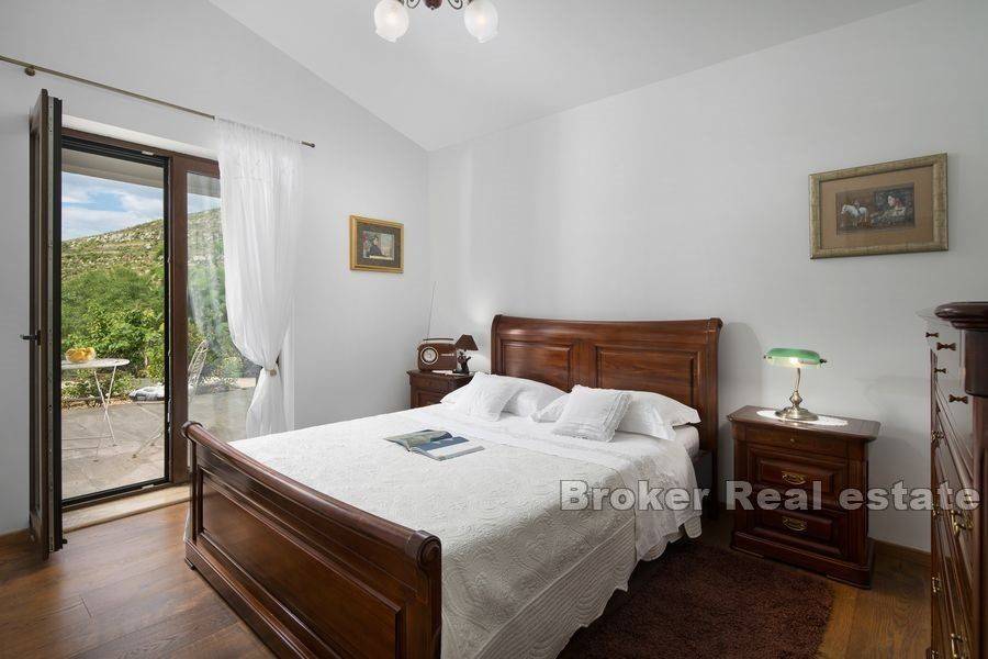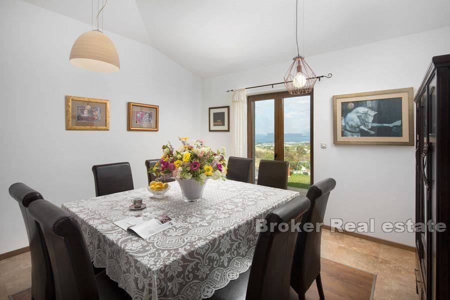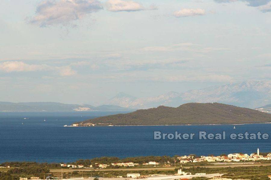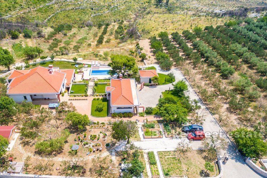 Unique property with a panoramic sea view located in a quiet environment, just a few minutes’ drive from Trogir and the airport. Land with area of 14208 m2 consists of 10530 m2 of agricultural part and 3678 m2 of building part. On the agricultural part of the land there is an olive grove with 350 15-year-old trees, lawns of 600 m2, a garden and a garden. In the construction part, an area of 1770 m2 is built, while 1908 m2 is undeveloped. There are two houses, a swimming pool and a tavern on the constructed part of the building. The first house, the main one, has a living area of 350 m2, the indoor area is 275 m2, and the loggias and terraces are 75 m2. The basement of 187 m2 consists of an open concept kitchen with a dining room and living room, a toilet, two bedrooms, a space of 21.09 m2 with a sauna, a bathroom and access to a covered terrace. From the living room there is access to the loggia, from the kitchen to the terrace, one of the bedrooms has access to the loggia. The ground floor of 163 m2 consists of two spacious bedrooms with attached bathrooms, one of the bedrooms also has a living room, while the other has access to the terrace with an impressive view of the sea. It also has a gallery of 30 m2 with access to the terrace. The second house is an auxiliary house with a living area of 155 m2 and consists of a basement and a ground floor. The basement of 80 m2 consists of a kitchen with a dining room with access to the balcony and rooms of 23, 36 m2 with entertainment and sports content. The ground floor of 75 m2 consists of a spacious living room, toilet. It also has a tavern of 55 m2 and a pool house of 60 m2 with basement and terrace of 38 m2 and basement space of 22 m2. The outdoor area is enriched with a swimming pool measuring 10 x 4 meters with a sunbathing area, a summer kitchen, a barbecue and an outdoor dining room covered with an old pine tree.