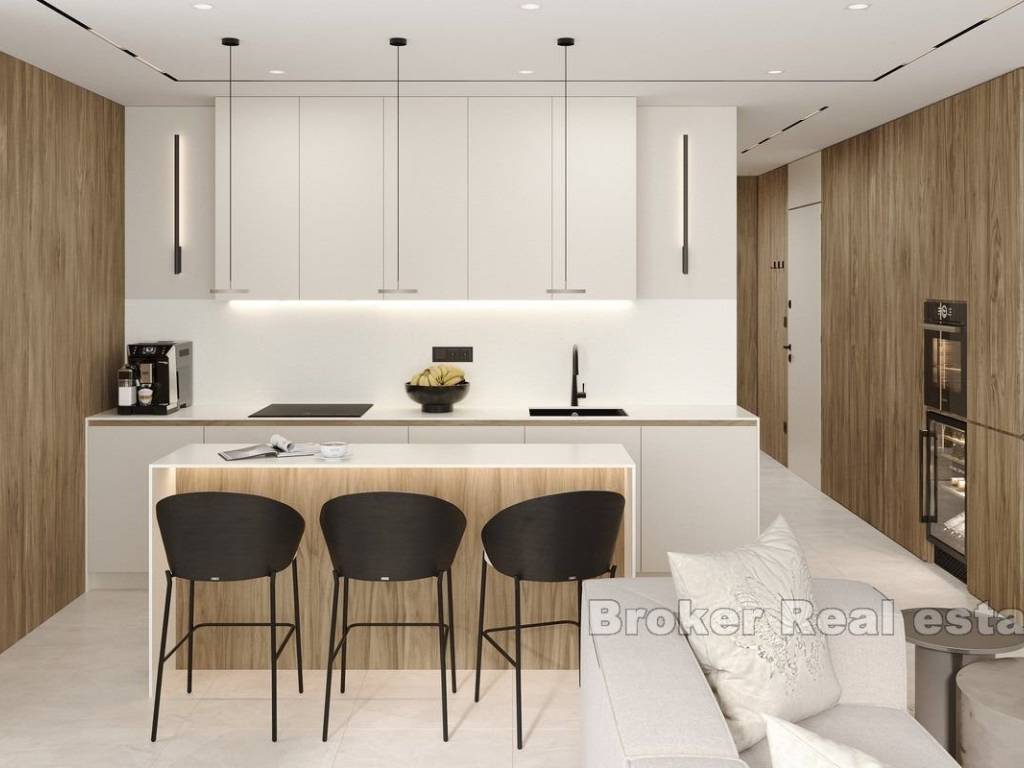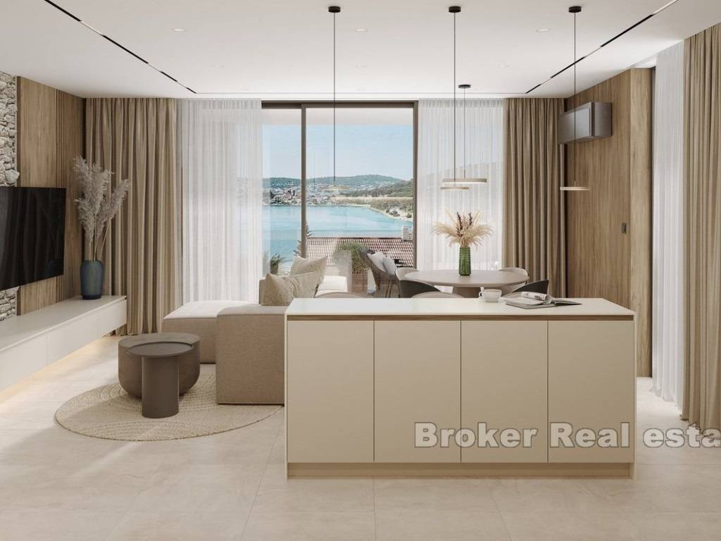 This modern apartment is located in a newly built building consisting of only three luxury apartments, ideally situated in Rogoznica, within walking distance to both the city center and the sea. The property offers stunning panoramic sea views, a private pool, and is built to the highest standards using premium materials and custom-designed furniture. The apartment is delivered fully furnished and ready for immediate occupancy. The interior includes custom-built furniture, ceramic tile flooring, and a mix of tiles, stone, and wood for the decking on both covered and uncovered terraces. The bathrooms and guest toilets are equipped with high-quality sanitary fixtures, while modern lighting fixtures, a secure entrance door, and interior doors with magnetic locks further enhance the property’s luxury. The apartment also features carpets, curtains, Zip screens for sun shading, and a full range of furniture, including beds, sofas, a dining table, and chairs. The kitchen is fully equipped with AEG appliances, including a washing machine, and a wine cellar adds a luxurious touch. Additional features include Daikin Emura heating and cooling system, electric underfloor heating in the bathrooms, and Reynaers aluminum lift-and-slide windows offering unobstructed views. The apartment also features Fixscreen Renson sun shading for added comfort, and elegant glass railings on the terraces maximize the spectacular sea views. The total area of the apartment is 202.06 m², which includes 68.30 m² of interior space, 13.00 m² of covered terraces, 69.40 m² of uncovered terraces and garden around the pool, 23.00 m² for the pool, and 28.36 m² for the pool machinery room. The price includes the fully furnished apartment, pool, and a parking space in the underground garage. The listed price is exclusive of VAT.
