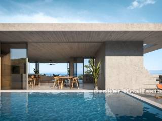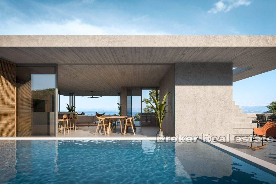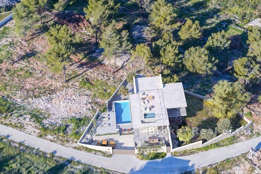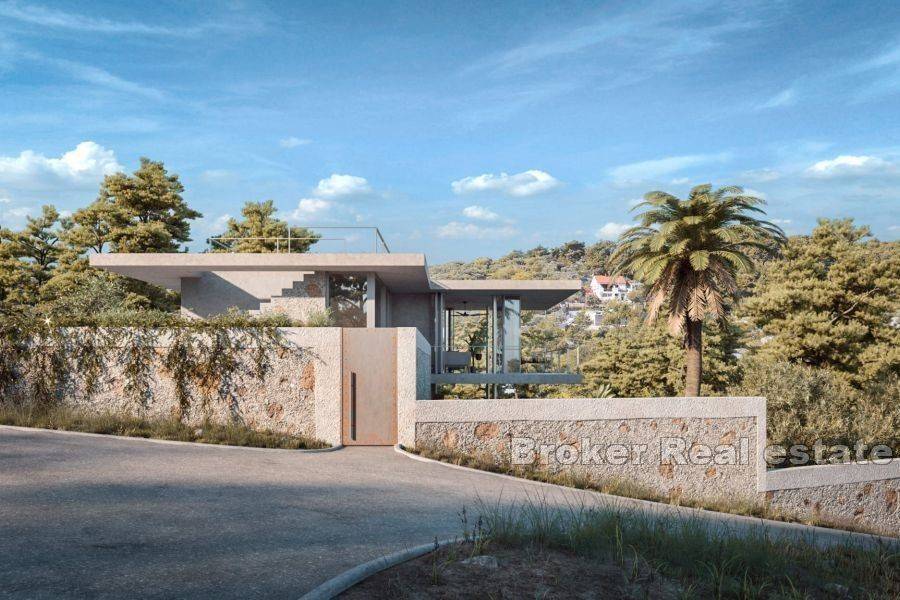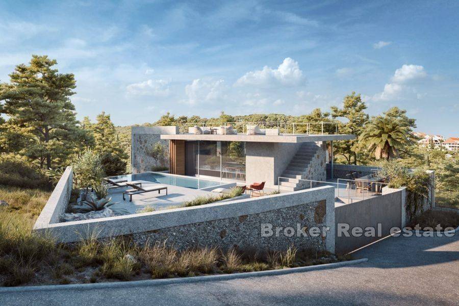 Elegantno građevno zemljište s projektom za gradnju vile i pogledom na more, smješteno na sjevernoj strani otoka Brača, u slikovitom dalmatinskom mjestu, ukupne površine od 833 m2. Zemljište se nalazi na blago povišenom kaskadnom terenu koji osigurava nekretnini prekrasni pogled na more i Brački kanal. Cijena uključuje i gotovi projekt, na temelju kojeg će se dobiti građevinska dozvola za gradnju vile na dvije etaže, ukupne površine 212 m2. Vila se sastoji od prizemlja (tri spavaonice sa kupaonicama, soba za teretanu, hodnik, garderoba, te dvije ostave) i kata (dnevni prostor otvorenog tipa od 57 m2, sa izlazom na natkrivenu terasu i bazen, te dodatni toilet za goste). Vila takoder ima stepenice za krovnu terasu koja je zamišljena kao sunčalište. Na terenu se još nalazi prostor za parking 2 auta. Nekretnina predstavlja odličnu investiciju u vidu idealno pozicionirane, moderno isplanirane vile, smještene u mirnom okruženju, sa prekrasnim pogledom koji nikog neće ostaviti ravnodušnim. Svi dodatni sadržaji (trgovine, restorani, pošta, ljekarna, pekara..) se nalaze unutar kratke pješačke udaljenosti od nekretnine.