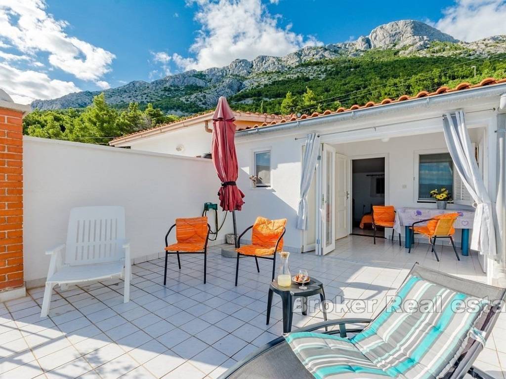 A spacious apartment house with a total area of 160 m² on 4 floors is for sale, already with an established tourist rental business. The ground floor features a functional kitchen and storage room, while the first and second floors consist of two-bedroom apartments. The third floor contains a studio apartment. Each floor has a balcony with a beautiful sea view, allowing guests to relax while enjoying the panorama of the Adriatic. The property includes a yard of 168 m², and the building generates a stable income during the summer season. Located in a peaceful area, the house is ideal for relaxation, and in the vicinity, there are a supermarket, restaurant, and beach, while the center of Omiš is just 8 km away.