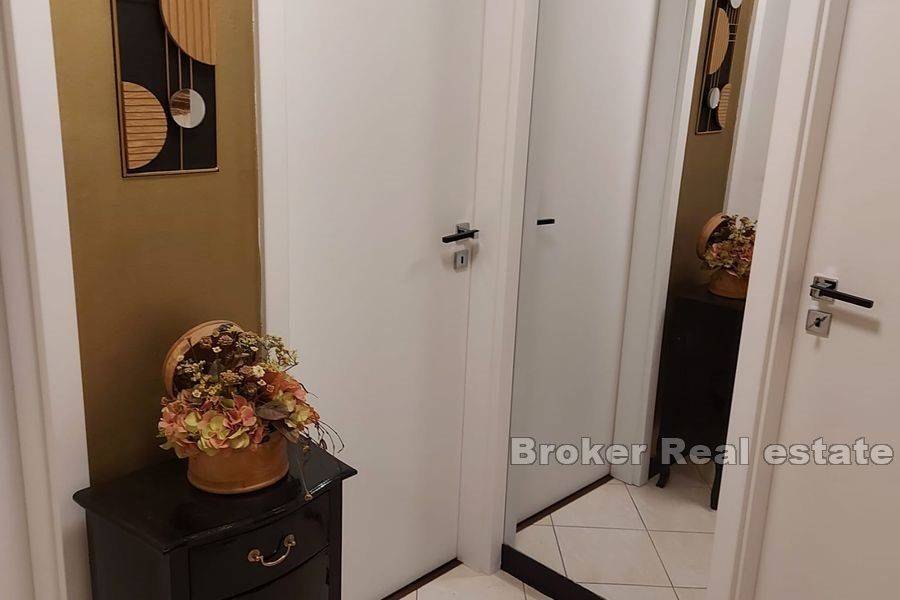 Two bedroom, modernly furnished apartment, close to the city center, for sale. The apartment has a north-west-south orientation and is located on the second floor of a residential building without an elevator. In 50,1 m² are placed a hallway, two bedrooms, a bathroom, a kitchen with a dining room and a living room. The apartment also has two balconies, one to the north and the other to the south, with a usable area of 9,16 m². The apartment is air conditioned and free public parking is located in the immediate vicinity of the building. The waterfront and Diocletian’s Palace are a few minutes’ walk from the apartment, as well as all the necessary facilities. Due to its location, it is an excellent choice for tourist rentals.