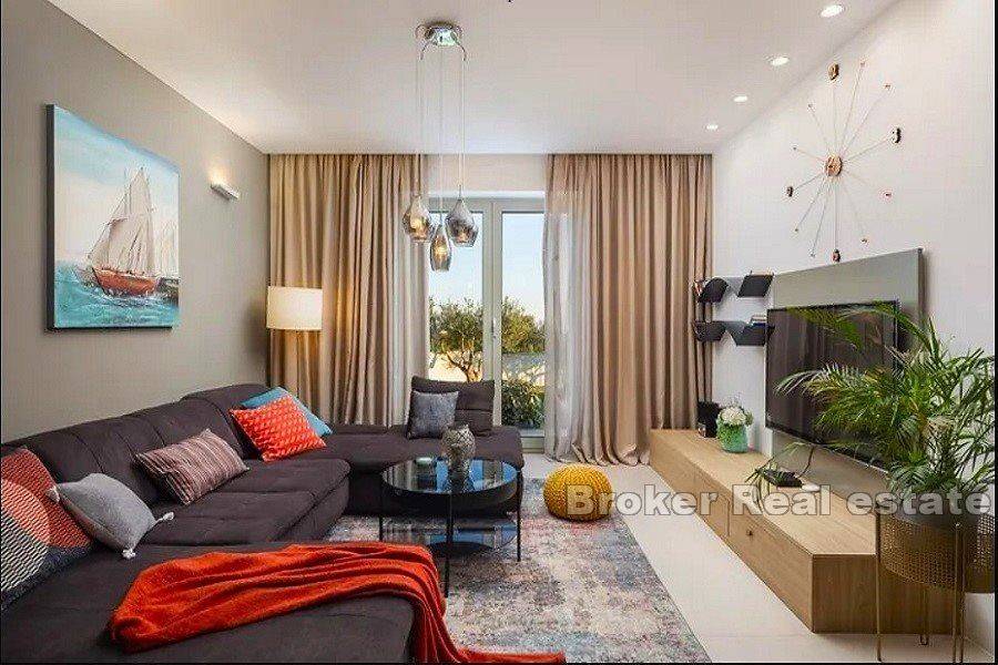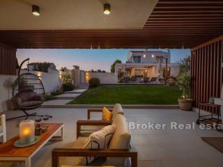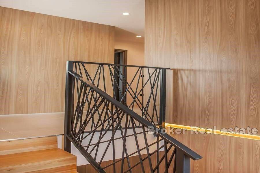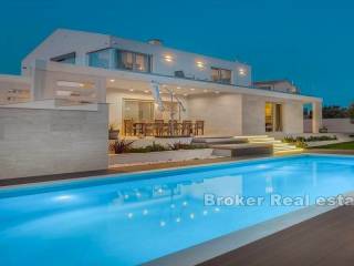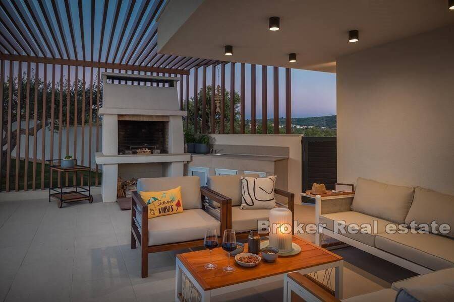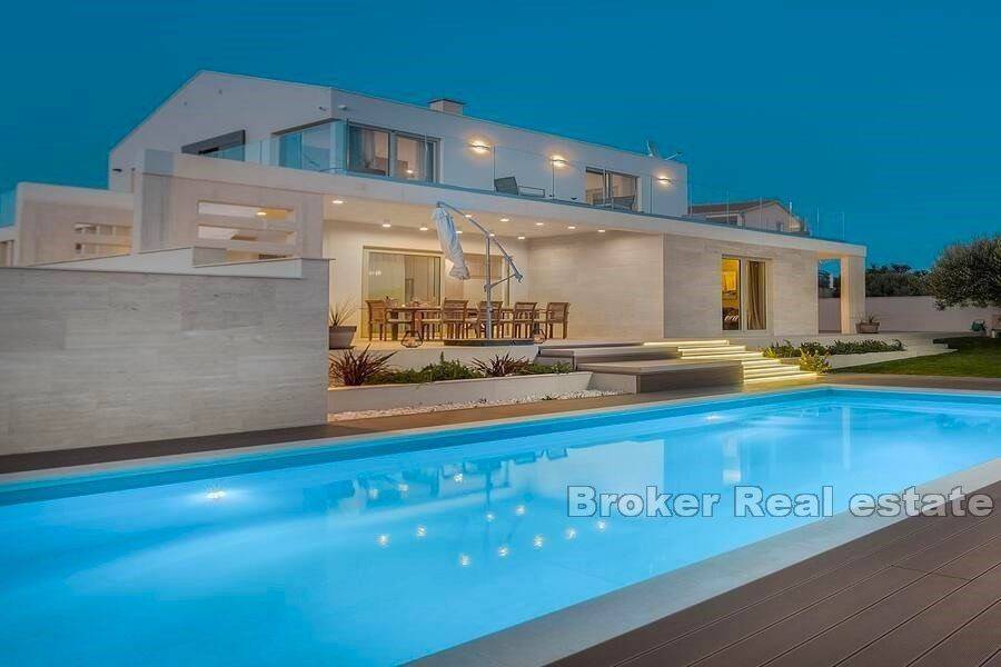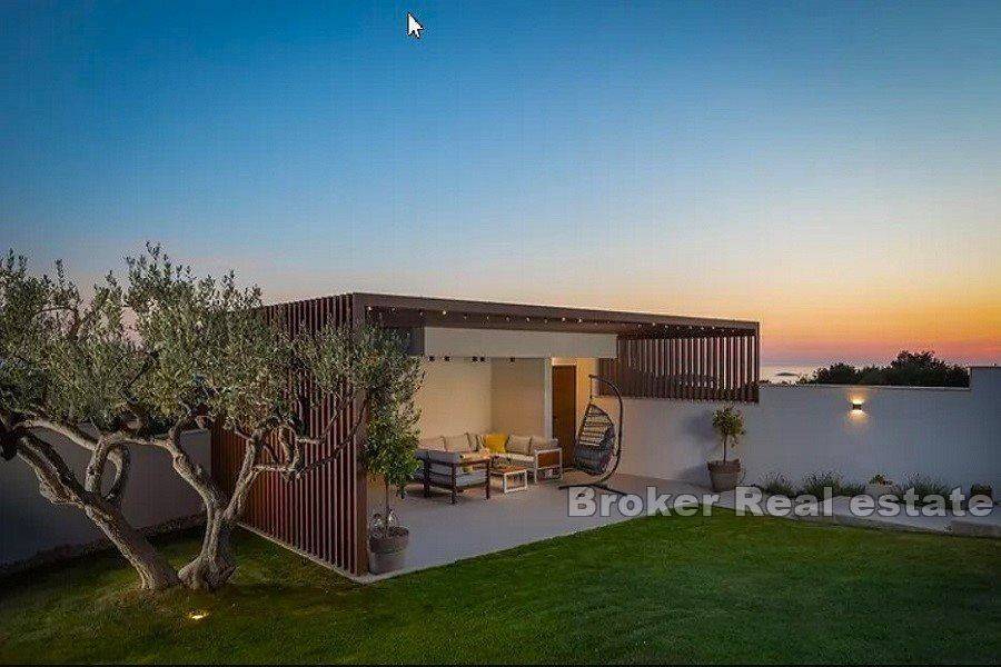 Luxury villa in Primošten with sea view. The superbly equipped and decorated villa is spread over three floors: The basement with two entrances, one outside and one inside, is designed as a playroom for children and adults, on this floor there is also a storage room and a laundry room. The ground floor consists of a kitchen and dining room, a spacious living room with access to a covered terrace, a bedroom with a separate entrance and a bathroom. The first floor consists of three bedrooms, each with its own bathroom and access to the south-facing terraces, which offer a panoramic view of the sea and the surrounding nature. The yard which is spacious, all horticulture is under irrigation system. on it, in addition to the heated swimming pool with a sunbathing area, there is also an outdoor kitchen, a fireplace, a pergola, a toilet and a shower The villa is furnished with custom-made furniture and is also superbly equipped: video/alarm system, underfloor heating, heat pump for heating and cooling, solar panels for hot water, wood-burning fireplace, 5 indoor air conditioning units, porcelain panels on the edges of the garden, fast charger for electric cars, etc.
