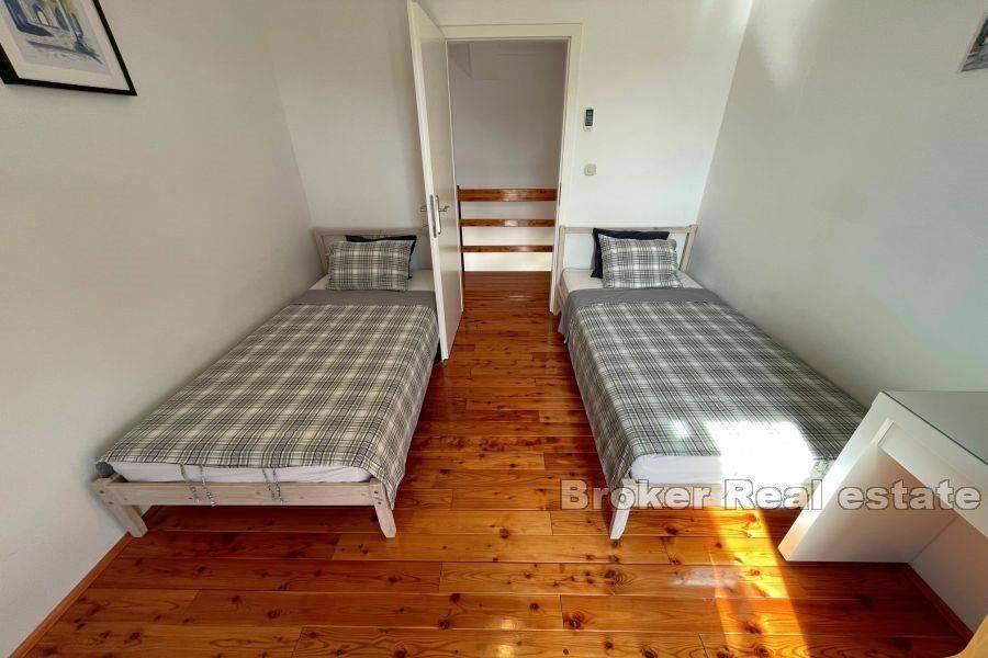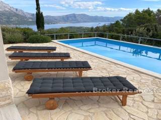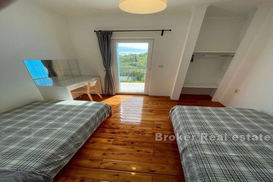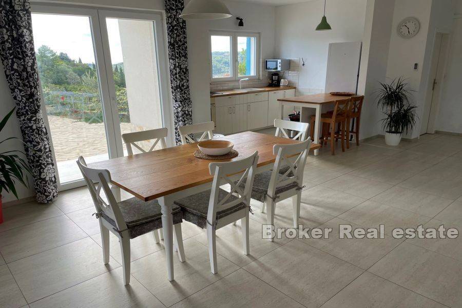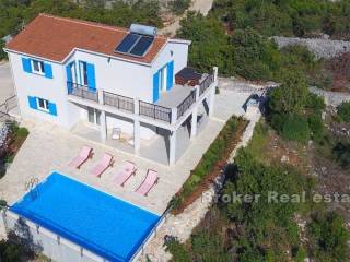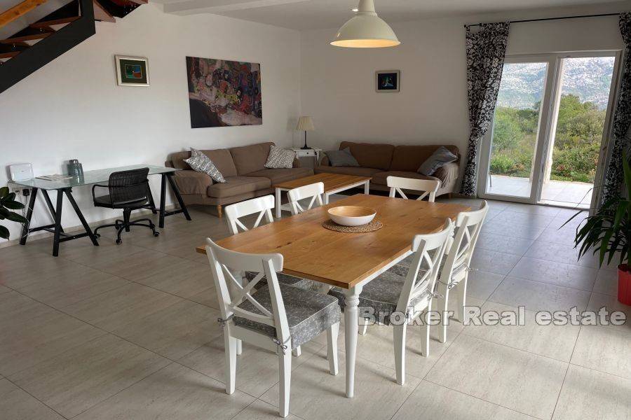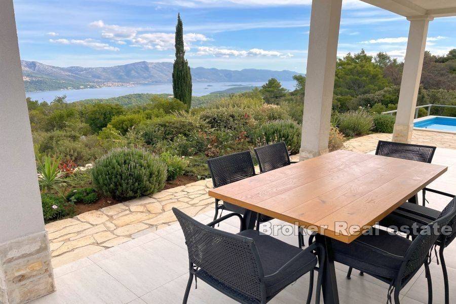 For sale is a property with a total living area of ​​230 m2 on the island of Korčula on a plot of land of 400 m2. The property consists of three floors and was built in 2017. On the first floor in the basement of the house there is a garage of 60 m2. On the second floor, on the ground floor, there is a kitchen with a dining room and a living room with access to a spacious terrace with a swimming pool and outdoor furniture. In addition to the pool, you can also enjoy the outdoor grill, in front of which there is an outdoor dining room. On the third floor there are two bathrooms and three bedrooms as well as a 24 m2 terrace with a wonderful view of the sea. What makes this house stand out is its quiet location, surrounded by Mediterranean plants, as well as an exceptional open view of the sea. The interior of the house has a large flow of daylight. Considering that it is for sale fully furnished, it does not require any additional investments. The property also has two outdoor parking spaces. The property is 750 meters from the sea as the crow flies and 2 km from the town of Korčula. It is a unique opportunity for investment either in the form of a tourist rental or as a vacation home.