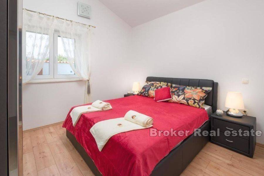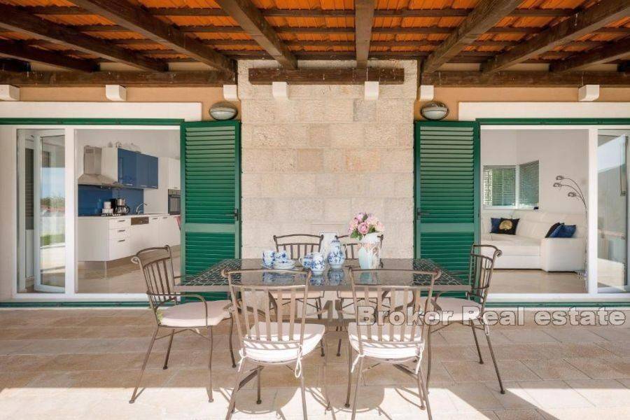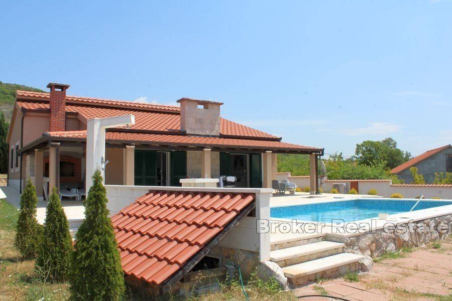 For sale is a modern house located near Split, built in 2017 on a plot of 1000 m2. It consists of a total of 150 m2 of living space that spreads over one floor. The house consists of three bedrooms, bathroom, spacious kitchen with dining area and living room with access to the terrace with outdoor furniture and barbecue. The interior is modernly equipped with quality materials dominated by neutral colors that contribute to the relaxing atmosphere of the house. The house is surrounded by a maintained garden of Mediterranean plants as well as a beautiful pool that dominates the entire exterior, and around which there is a sunbathing area with outdoor sun loungers. A soothing view of the mountains and peace and absolute privacy is a reason worth investing in and an unavoidable factor that this property offers. The property has three parking spaces, one of which is covered. The house is excellent for tourist rental because it has a complete offer that includes a children’s playground and is for sale fully furnished. The distance of the property from the center of Split is 15 km and from the airport Split 10 km. The distance of the house from the sea is 8 km. There is a project to build a tunnel that will ensure even better connection of the property with the center of Split. It is an investment that is definitely worth considering because it offers a return on investment and on the other hand can be used for a quiet family vacation.