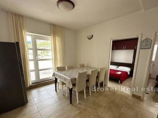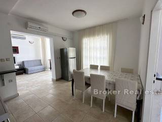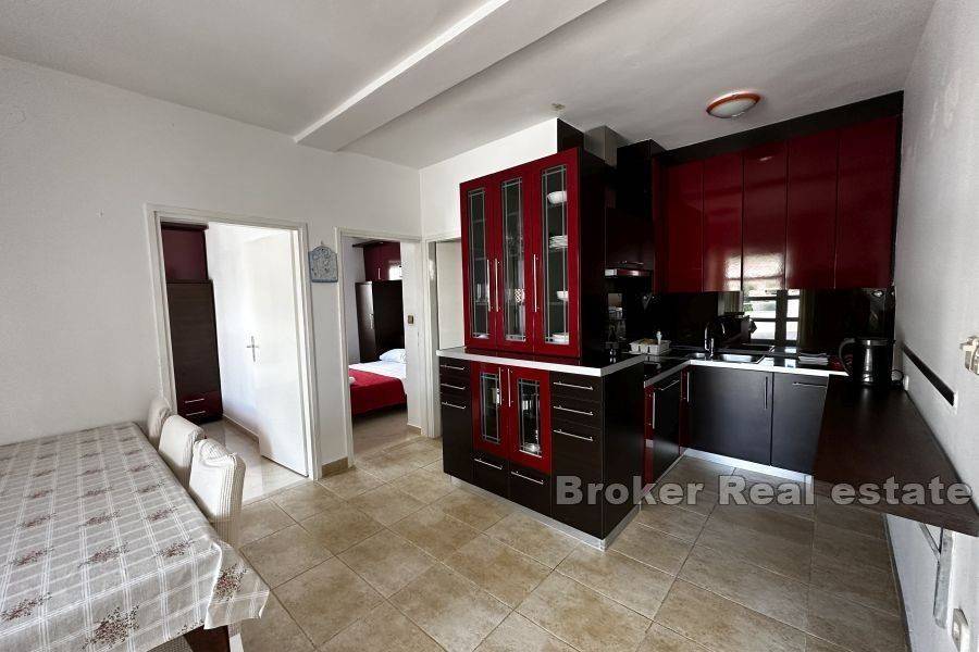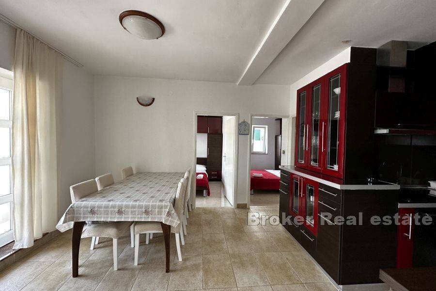 House with open sea view located 20 m from the sea near Primošten. The property with a total living area of 220 m2 is located on a plot of land of 193 m2 and is spread over three floors. On the basement floor there is a mini kitchen, one bathroom and a spacious room that offers the possibility for various purposes. The ground floor consists of a two-room apartment with a terrace with a barbecue. The apartment offers an open, stunning view of the sea. On the first floor there is a studio apartment with a sleeping and dining area, one bedroom with an attached bathroom and a one-bedroom apartment. The house has two parking spaces and a mooring for use. Proximity to all the necessary facilities for life and being surrounded by real estate in the tourist business offers the potential to continue the already well-established business.