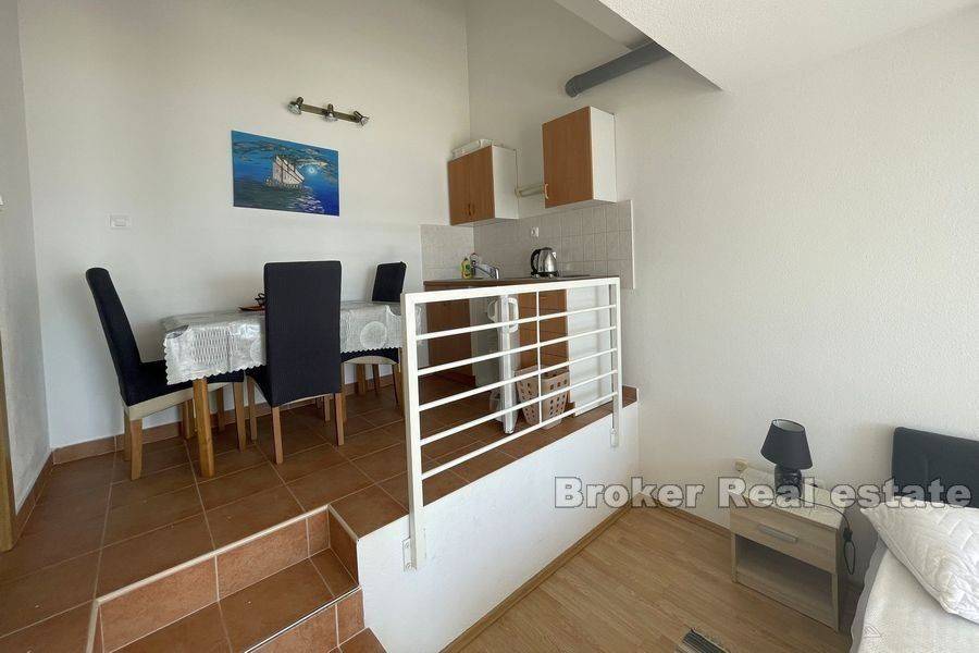 Detached cascading house located first row to the sea. Total living area of approximately 861.75 m2, on a plot of 637 m2 and with an additional plot of 264 m2 that serves as a parking lot with approximately 10 parking spaces. On the ground floor of this magnificent cascading house there are two studio apartments with terraces and direct access to the beach, with two storage rooms. On the first floor there are two duplex apartments and one studio apartment. On the next floor there is another studio apartment, on the third floor there is a garage and two apartments, one one-bedroom and one two-bedroom. On the fourth floor there are two apartments with the possibility of conversion one more . All apartments are fully furnished and equipped and have a balcony or terrace on the south side overlooking the sea. There are 8 parking spaces next to the house, and an additional 10 on the land near the house. The advantage of this exceptional property is the location located on the beach, with a beautiful view. It is well-established in tourism, 11 kilometers away from the old town of Split, 13 kilometers from Omis. Nearby there is a promenade along the beach with many facilities for children, restaurants, bars.