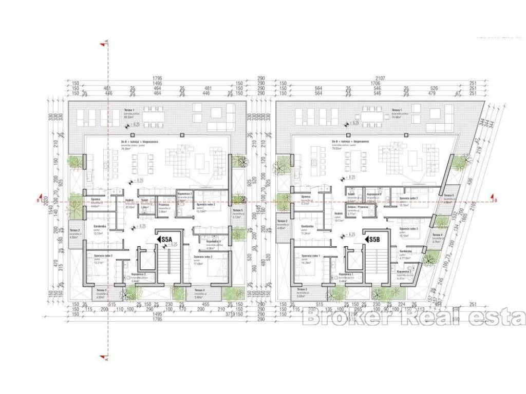 A three-bedroom apartment located on the second floor of a building in the first row to the sea on Čiovo, just a few meters from the pebble beach. The apartment area is 249 m2, and offers direct access by elevator that connects the apartment to the underground garage. The building also has a shared swimming pool, spacious sun terraces and pleasant outdoor areas for dining and socializing. It is surrounded by lush green areas that create an additional sense of privacy and comfort. In the immediate vicinity are beaches with bars, sports fields, and shops and restaurants in the town center, about 300 meters away. Split airport is easily accessible in just 15 minutes by car. The location offers the perfect combination of peace and proximity to necessary amenities. The property represents a top investment, either for permanent residence or for the development of a tourism business. Buyers can choose the complete equipment and furniture of the apartment, while professional maintenance of the facilities guarantees long-lasting standard and value. On the first two floors of the same building, two-bedroom and one-bedroom apartments are available, under the agency code 2029/90. There are also apartments for sale in the neighboring building, codes: 2029/88, 2029/89.