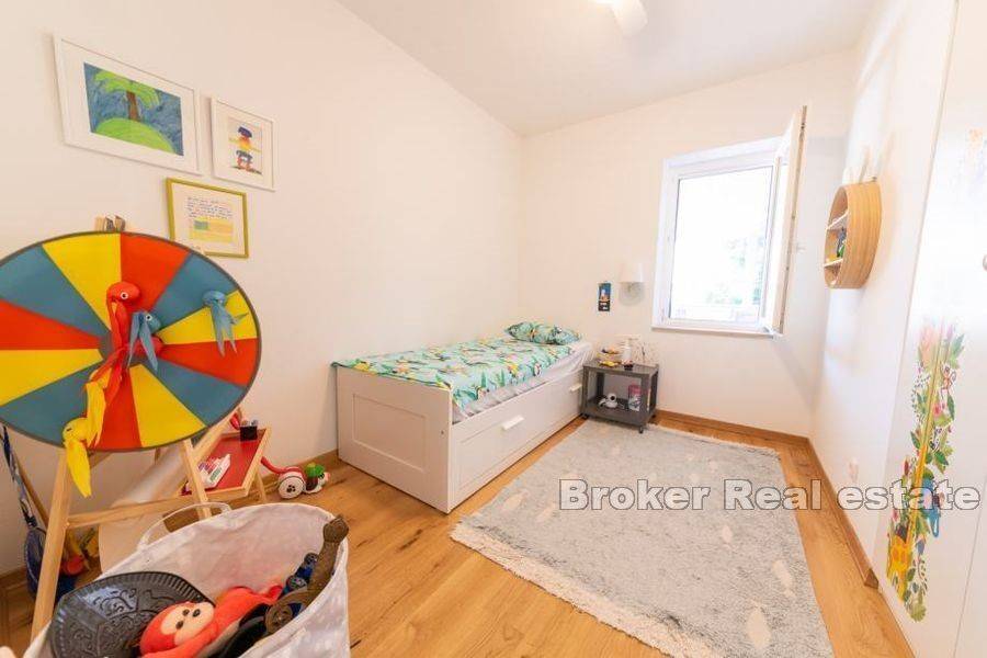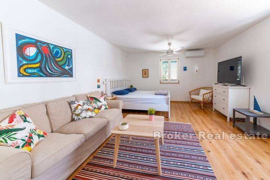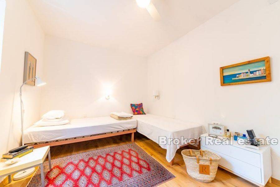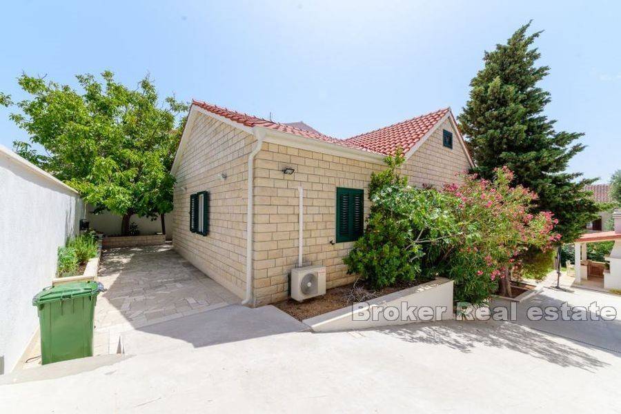 Renovated stone house on the island of Brač. This spacious stone house was completely renovated in 2018 and the roof was completely renovated in 2021. The house of 200 m2 is located on a plot of 505 m2 in the center on the south side of Brac. The property is spread over three floors. The ground floor has a kitchen, bathroom, living room and exit to the terrace. Upstairs there is a kitchen, bathroom, one small toilet, 2 bedrooms and a living room with access to the terrace. On the first floor there is also a separate apartment with a bedroom and a bathroom. On the third floor there is an attic of 100 m2. In front of the house there is a large garden and a summer kitchen with a fireplace and a bar. There is also a spacious garage within the house. The house is located near all amenities important for life. Distance from the sea is 250 m. The excellent condition of the house and the top location make this house perfect for a family or for a tourist business.