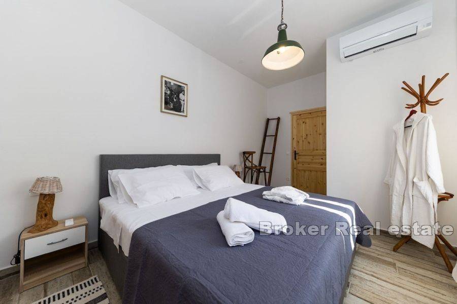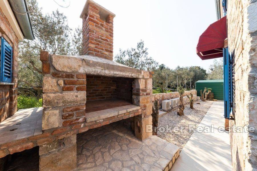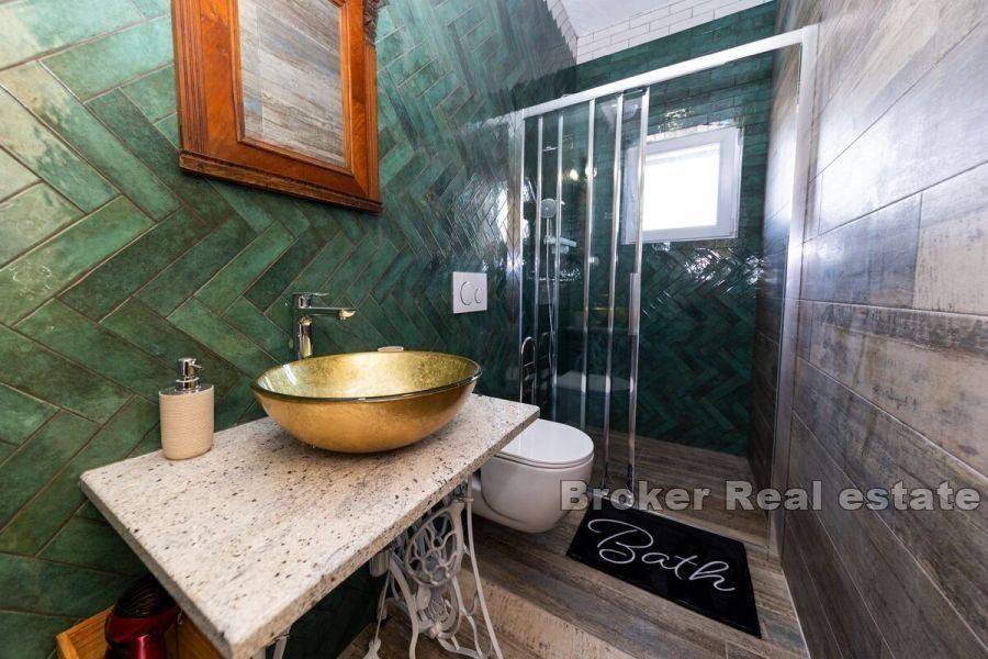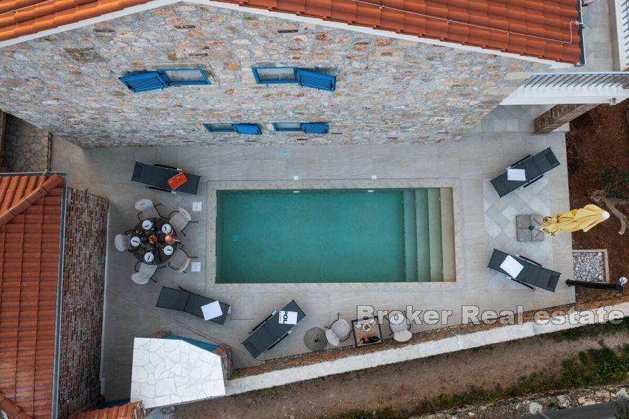 A great timeless stone house located in a quiet environment offering an unobstructed view of the sea. Built on a plot of land of 493 m2, it extends over two comfortable floors with a total living area of 285 m2. It consists of an equipped kitchen and dining room, living room, five bedrooms, five bathrooms and a fitness room. On the landscaped, paved garden there is an essential swimming pool with a sunbathing area and an auxiliary facility with a summer kitchen and a fireplace. The house is fully furnished and enriched with colorful, playful elements and is being sold as such. An idyllic setting for socializing, especially in the summer, is offered by the covered terrace equipped with a dining table and chairs. A total of eight air conditioners are used for heating and cooling. The property is connected to the city’s water supply, while instead of sewerage, it has a three-chamber septic tank. In addition to being ideal for annual vacations and family living, this Dalmatian oasis woven from old rustic objects offers an excellent opportunity for tourist rental. The attractive place is adorned with beautiful beaches and offers countless possibilities for various activities.