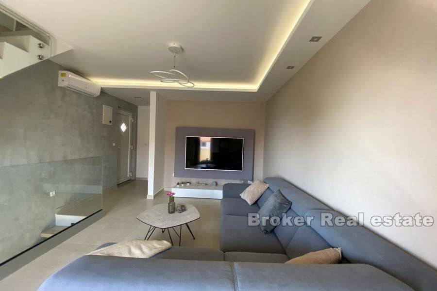 House with a total living area of approximately 302 m2 gross, located on a land with a total area of 460m2. It is located in the part of the island of Ciovo suitable for living and tourism, at a distance of about 160m from the sea. This spacious house on three floors and the fourth basement floor leaves the owner a lot of tourist and other opportunities. The house is designed in such a way that on one side there is a luxury three-storey apartment, with dining room, bedroom and bathroom with toilet on the ground floor, living room, bedroom and bathroom with toilet on the first floor, and two spacious rooms on the floor high attic. The other side of the house is divided into two apartments. On the ground floor there is an apartment with kitchen, living room, bedroom and bathroom with toilet. On the first floor there is a two-storey apartment connected to the attic floor. This apartment consists of a kitchen, living room, bathroom with toilet and three bedrooms. The ground floor and the first floor have separate exits to the covered balconies of southern orientation, and each apartment has a built-in air conditioning system. The basement of the house is designed as a space for fitness and recreation with its own gym. In front of the house there is a courtyard with a swimming pool, jacuzzi and a barbecue area. The house also has 5 parking spaces. All necessary facilities (cafes, restaurants, shops) are located at a distance of about 500m, beach about 150m, doctor about 800m, bus station, marina and gas station are 5km away, and the airport 10km.
