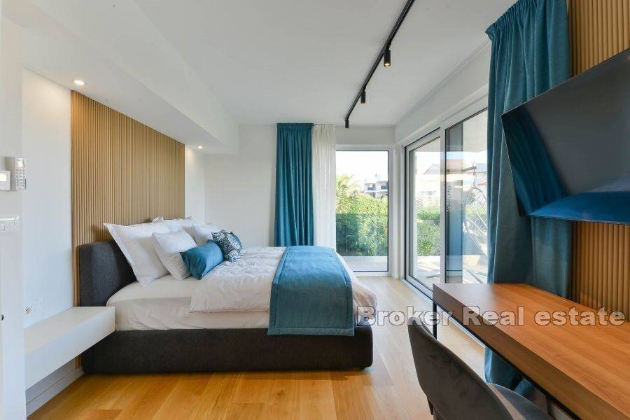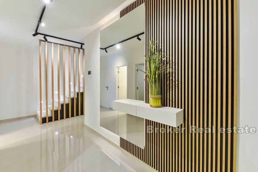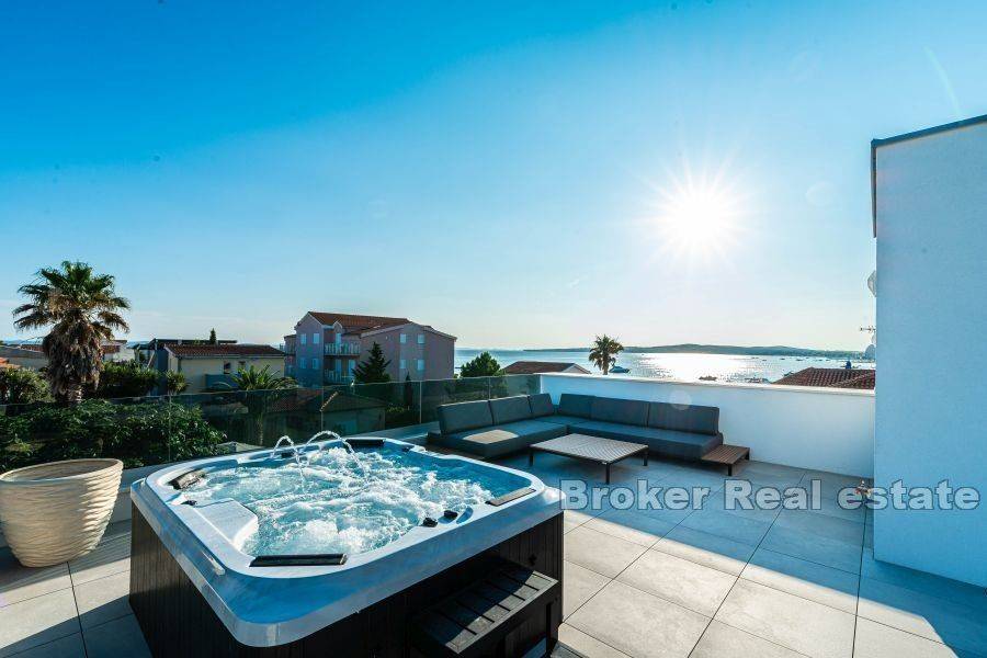 We mediate in sale of a beautiful semi- detached house on the island of Vir, built in 2023. The property consists of 148 m2 of total living space, and is spread over a plot of land of 268 m2. It is only 40 m distanted from the sea. The property is spread over 3 floors. On the ground floor there is a large living room, kitchen, dining room and a large terrace of 40 m2. On the first floor there are 4 luxuriously decorated rooms and two bathrooms. Some of the rooms also have access to a large terrace with a beautiful view of the sea. On the 3rd floor there is a roof terrace with a total area of 85 m2. On the terrace there is a summer kitchen, jacuzzi and relaxation area. The entire property is decorated with modern and luxurious furniture. The best materials and modern techniques were used in the construction of this property. The property is 40 m from the nearest beach, and it is located near all facilities necessary for everyday life, such as cafes, shops, promenades and restaurants.