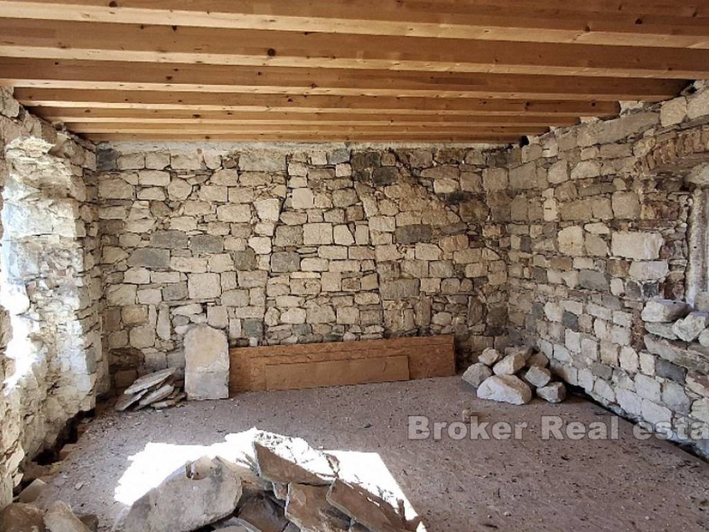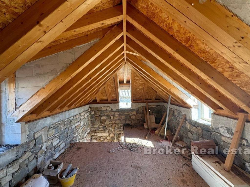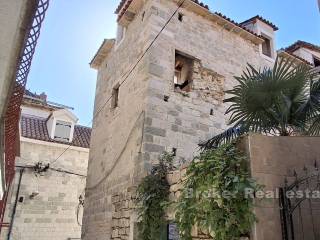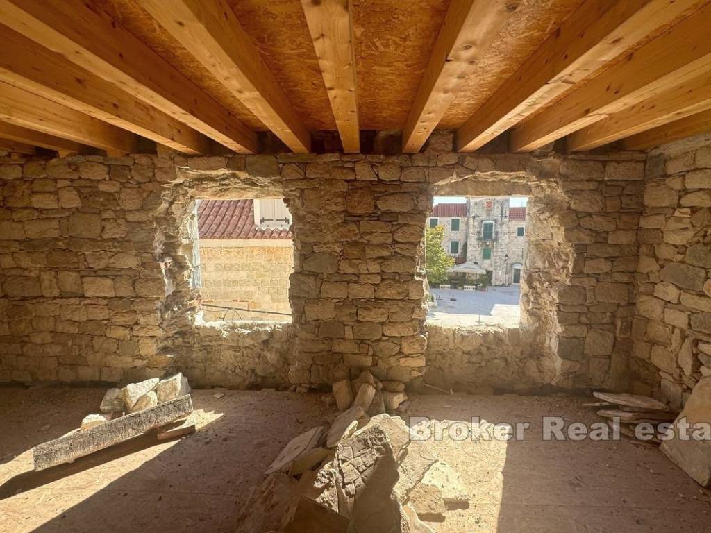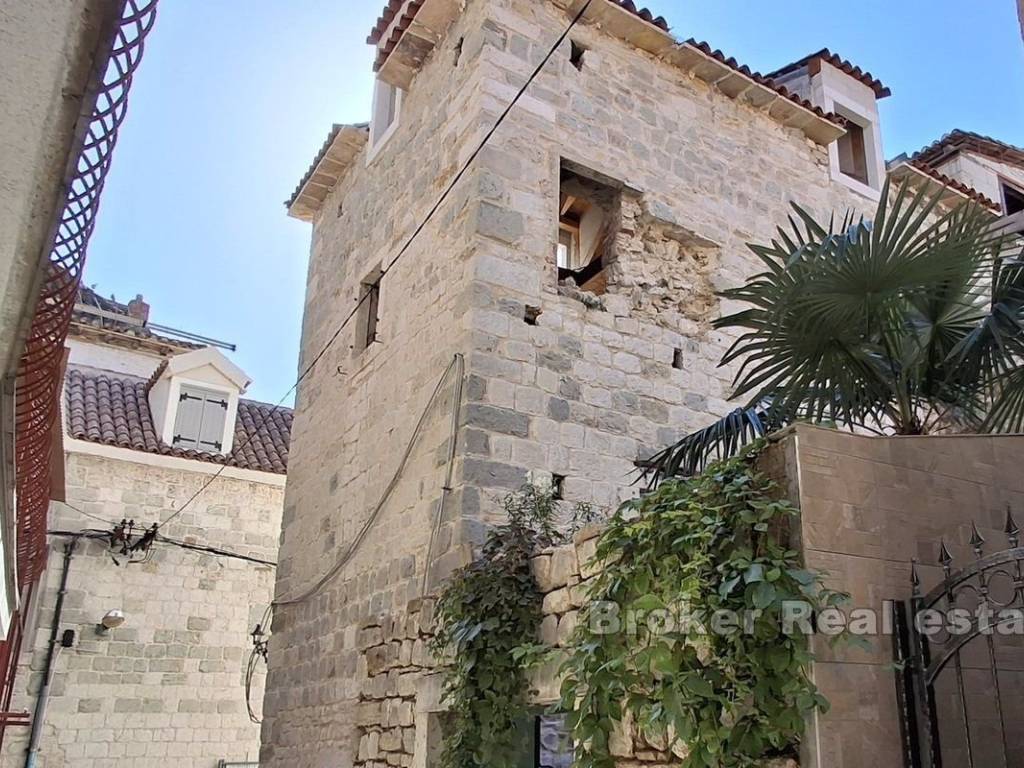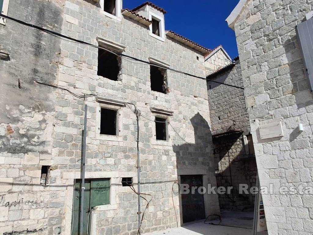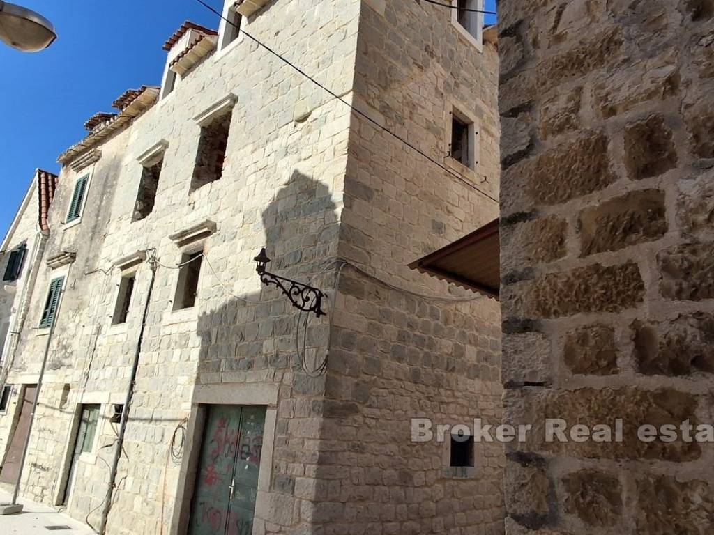 A stone house for renovation, located in the center of a picturesque Mediterranean town, offers the perfect combination of authentic Dalmatian charm and proximity to the sea. Just 40 meters from the waterfront, this property is spread over four floors and includes an internal courtyard that provides privacy, tranquility and space for outdoor relaxation. The renovation of the house has started, and the building permit has been secured. The project envisages the following floor plan: Ground floor: It is currently intended as a catering space, which opens up the possibility of additional income or starting your own business. Alternatively, the ground floor can be converted into a living area, ideal for a living room, kitchen or dining room, which would further increase the residential functionality. First floor: Designed as the main living area with a spacious living room, one bedroom and two bathrooms, it provides comfort and enough space for a family or a large number of guests. Second floor: On this floor there is an additional bedroom with a private bathroom, which provides comfort and privacy, and makes this space ideal for guests or family members. Attic (last floor): The plan provides for another bedroom with a bathroom, which makes use of the entire space of the house. This floor offers intimacy and a wonderful view of the sea, making it the perfect place for a peaceful vacation. The house is located in the center, a step away from all necessary amenities such as shops, restaurants, and cafes, which contributes to the practicality and comfort of life. On the higher floors and from the inner courtyard there is an enchanting view of the Adriatic. Beautiful beaches with crystal clear water are available nearby, which further adds to the tourist attraction of this property. Inner yard: Private outdoor space, a rarity for such stone houses in the center, ideal for relaxing, socializing and enjoying the Mediterranean ambience. Considering the position, this stone house represents an ideal opportunity for tourist rental, which makes it an attractive choice for investors. With the possibility of adapting the space, it can be used as a luxury apartment building or a cozy family home.