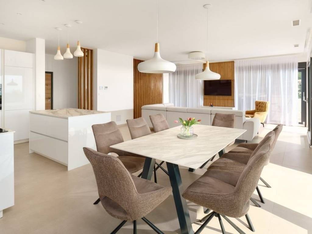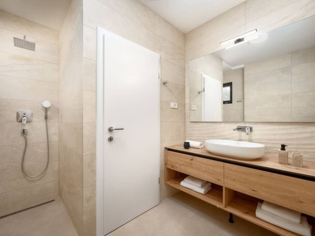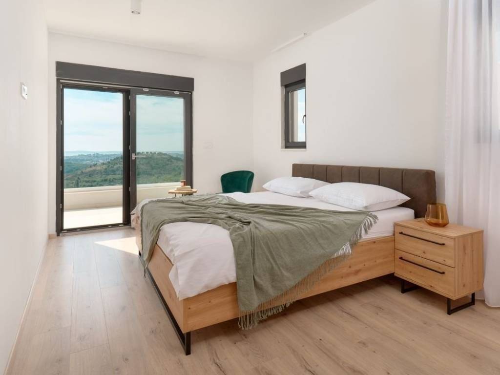 A luxury villa located in the immediate vicinity of Split offers a unique blend of sophisticated design, comfort and privacy. This elegant property, with its contemporary style and carefully thought-out details, ensures a top-notch stay experience. Surrounded by nature and villas, the location exudes peace and exclusivity The villa covers approximately 270m2 of living space, while the entire plot area covers 450m2. There are two outdoor parking spaces available, and the property is arranged over three floors – a basement, ground floor and first floor. The basement is provided for technical equipment for the pool, and is ideal for storage. The ground floor includes an entrance hall that leads to a spacious, open living room with kitchen and dining room, as well as one toilet and a small storage room. The living room opens onto a partially covered terrace, which offers a beautiful panoramic view of Split, Klis Fortress, the sea and the surrounding area. The terrace features a swimming pool with a sundeck, an outdoor dining area, a fireplace and a green area ideal for enjoying the outdoors. Also next to the fireplace, everything for an open summer kitchen is set up. Internal stairs lead to the first floor, where there are four elegantly decorated bedrooms, each with its own bathroom, and all rooms are air-conditioned. All bedrooms are south-facing and have access to a balcony with a beautiful view of the sea, Klis Fortress… There are two balconies on the first floor, one is north-facing and is 9.25m2, while the balcony with a south orientation is 31.55m2. High-quality materials were used in the construction, and special attention was paid to every detail, ensuring the elegance and functionality of the space. The villa exudes luxury and innovative solutions, and additional comfort and security are provided by underfloor heating, security doors, solar panels, which greatly contribute to the comfort of the stay, and security video surveillance is in preparation… Thanks to its prime location, the property is ideal for both a quiet family life and a tourist rental. All key amenities are nearby – shops, restaurants, and the cities of Solin and Split. The villa is being sold fully furnished, ready to move in and enjoy the unique Mediterranean ambiance.